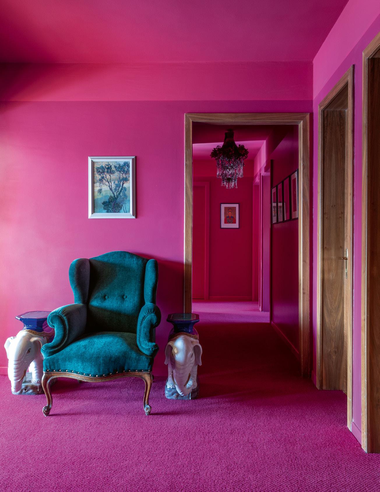 Dans l’entrée couleur magenta, un fauteuil des propriétaires recouvert de velours turquoise. Lustre Mignon