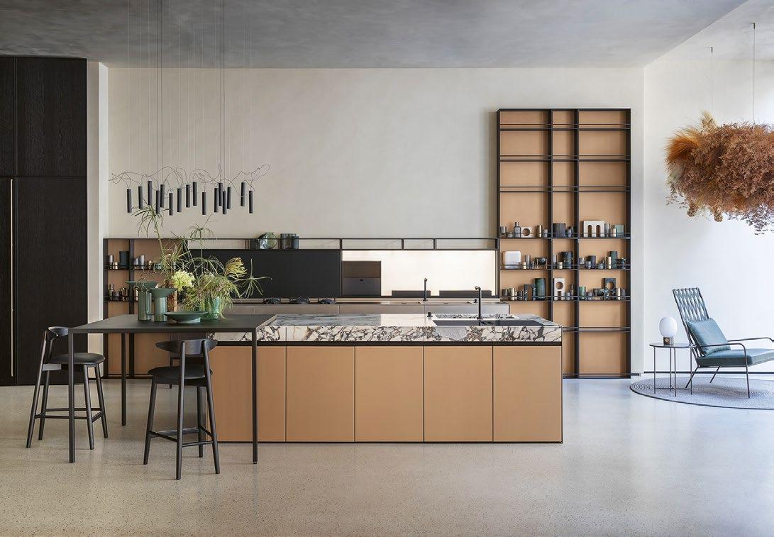 La cuisine Sei, qui tire son nom de l’épaisseur ultra-fine (6 mm) des plateaux, des flancs et des étagères, exprime un équilibre parfait entre matériaux et détails techniques. L’îlot se distingue par son plan en marbre Ocean Storm. euromobil.com