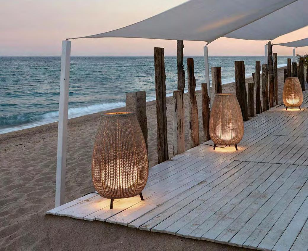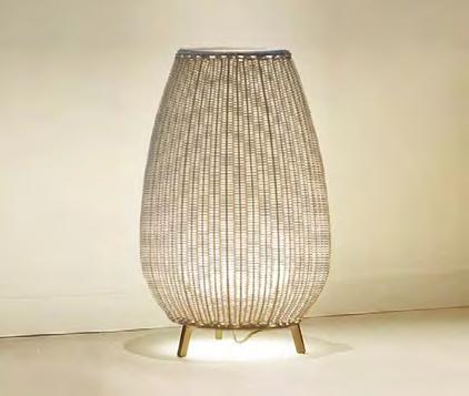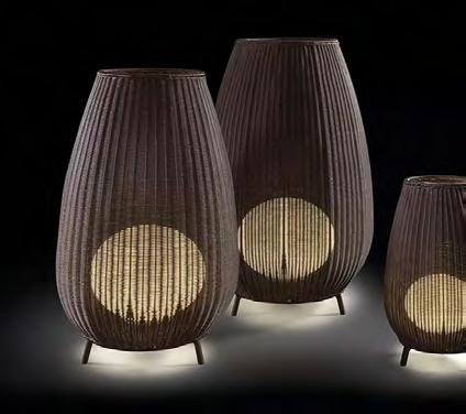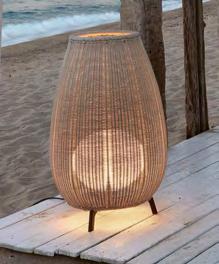 The size and shape of this collection pay a subtle and discreet homage to the terracotta amphora formerly used to store food. In this collection we have used a synthetic wicker to make up big handmade baskets as shades with a tripod foot subjected to a cataphoresis treatment. The light source is located inside the polyethylene ellipse which grants its water proofing. The light emitted by the Amphora collection is full of nuances and shapes.