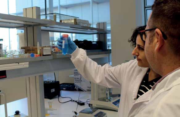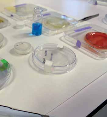 Hij pakt een pipet en een flesje vloeistof om het te laten zien. Op de werktafel liggen nog meer petrischaaltjes met substanties en stukjes materiaal. Toen de waterafstotende versie eenmaal af was ging het team door met hun uitvindingen. Door resten van sinaasappelschillen te mengen met de cellulose wordt het materiaal antibacterieel. En door er een beetje zwavelzuur aan toe te voegen kun je zien of de temperatuurketen verbroken is. Op het verpakkingsmateriaal ligt een regenboogachtig filmpje dat doorzichtig wordt als er vocht bij komt, hetgeen gebeurt als de temperatuur stijgt.