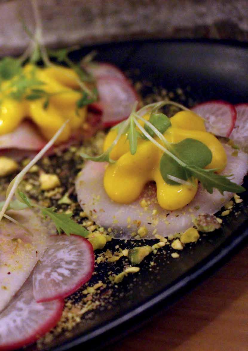 Na zoveel praten over eten, krijgen we ook trek. We spitten de menukaart door en bestellen wat gerechtjes. Vooraf krijgen we gefrituurde bloemkool stukjes in een krokant jasje van broodkruim met vegan parmezaan en knoflook geserveerd. Erg verrassend en lekker! De zachte bloemkoolsmaak wordt opgepept met de pittige smaken van het krokante ‘jasje’.