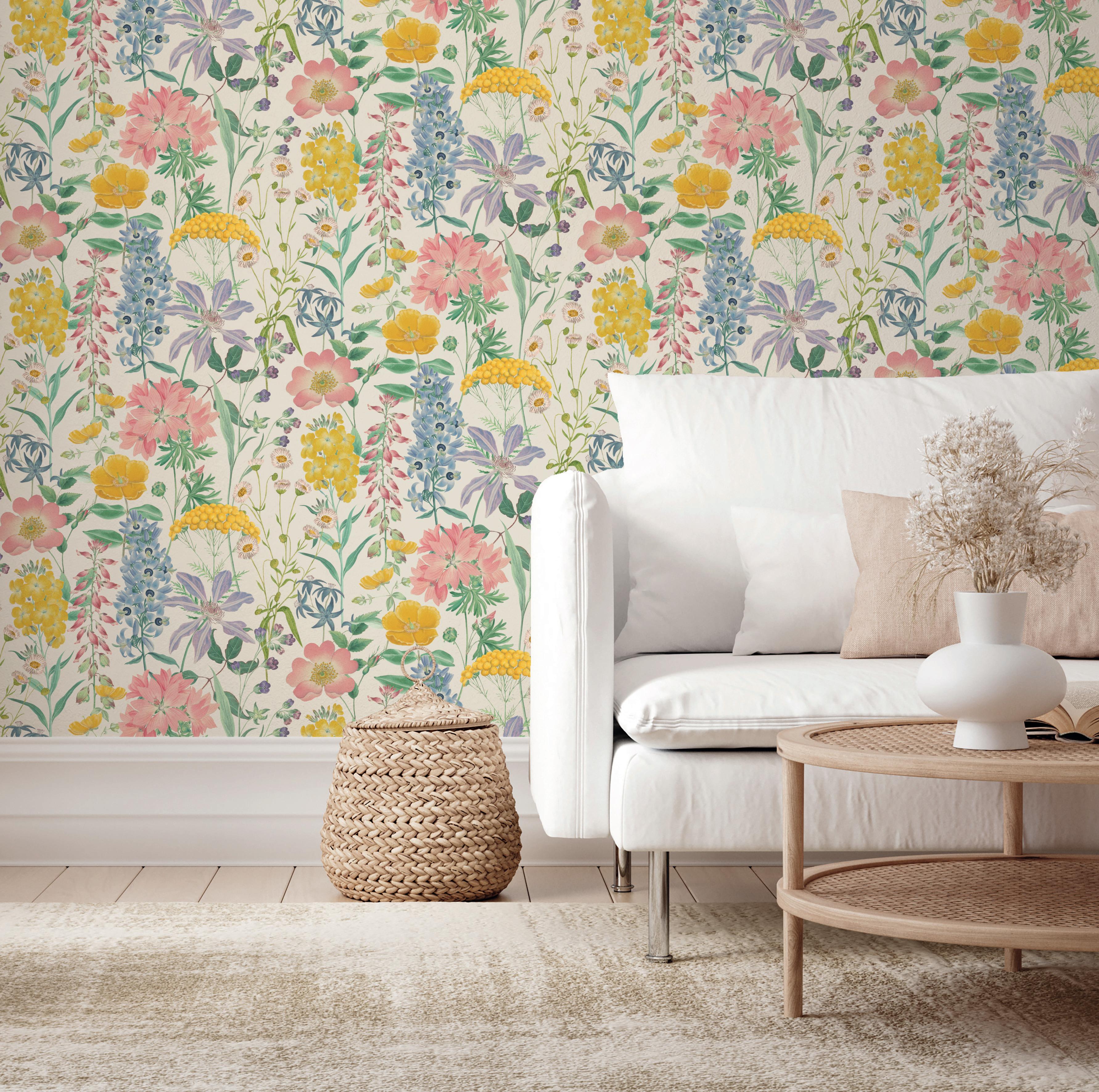 A charming medley of yellow, violet, and pink florals dance across a cream background, accompanied by cheerful daisies and elegant clematis, evoking the essence of a quaint country garden.
