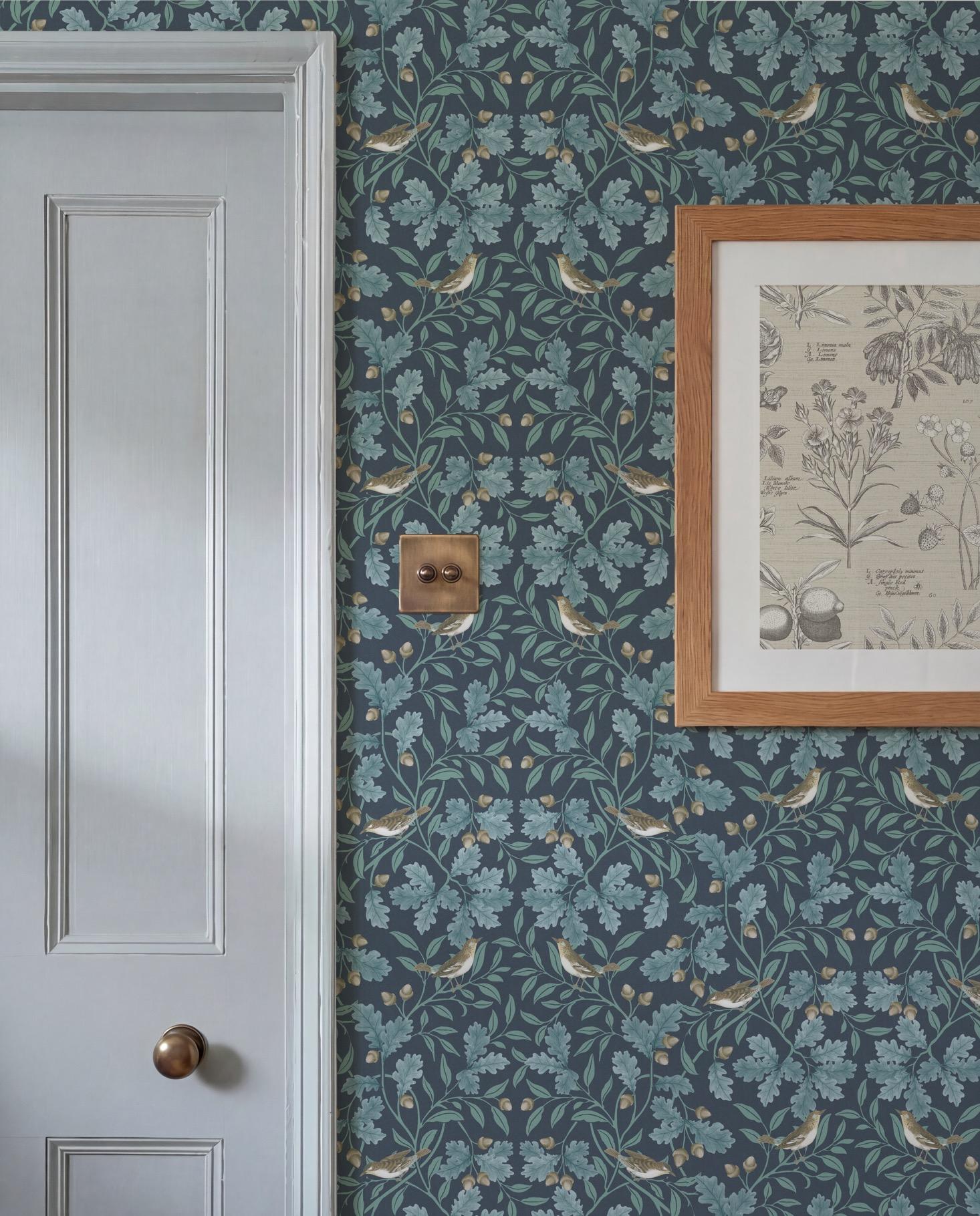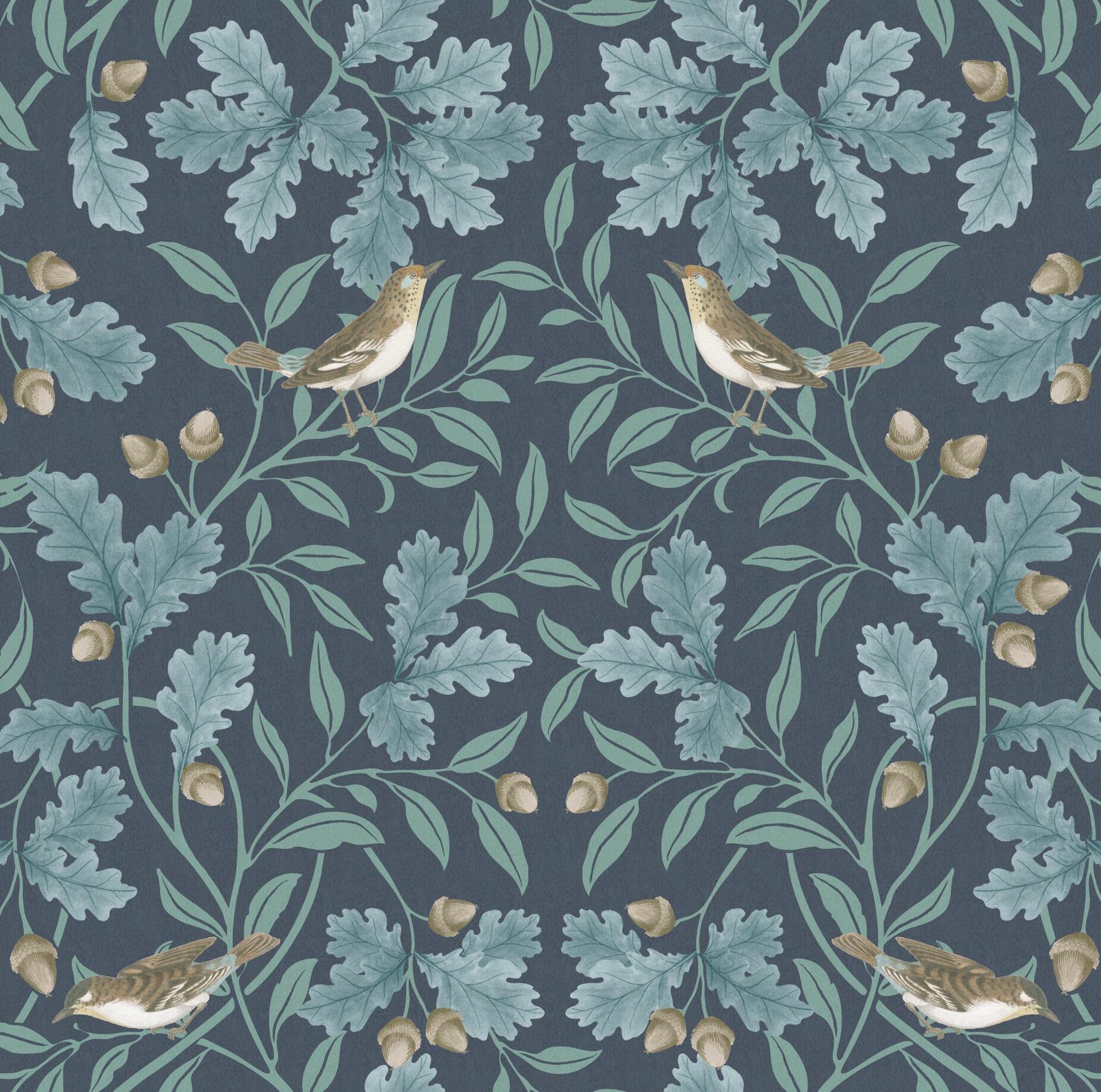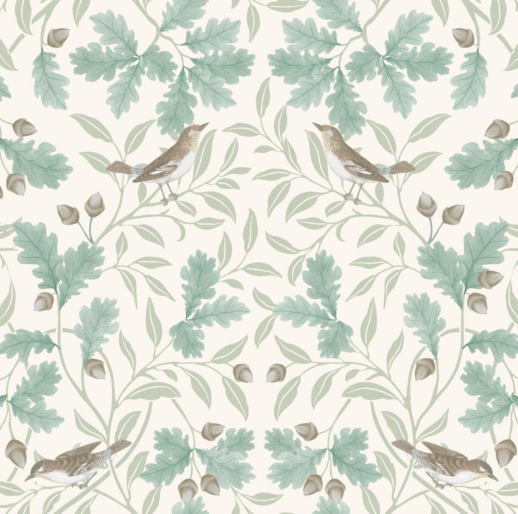 The RHS Woodland Songbirds Wallpaper showcases charming songbirds nestled amongst delicate branches. This enchanting design brings a touch of woodland magic indoors, creating a calming and sophisticated atmosphere.