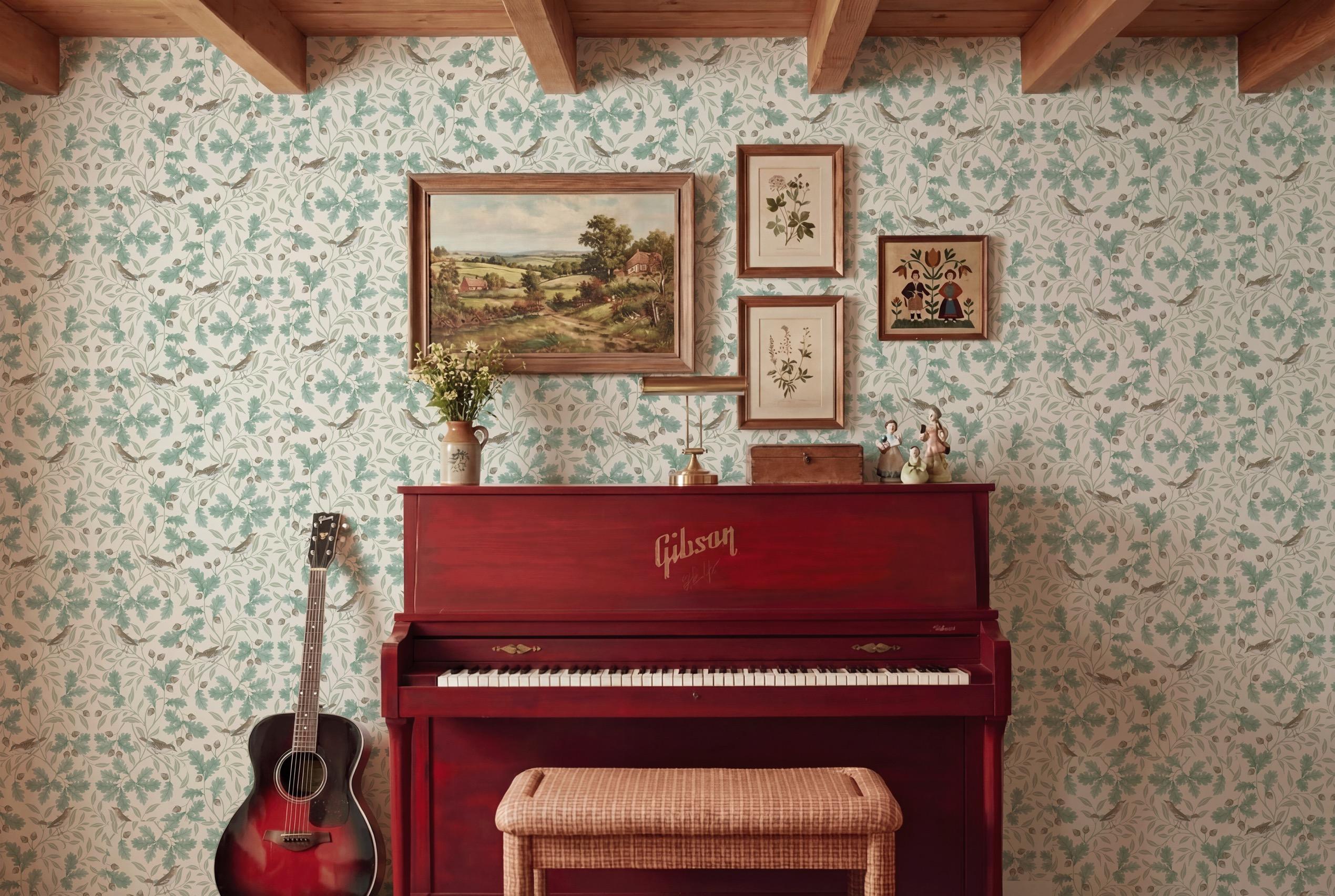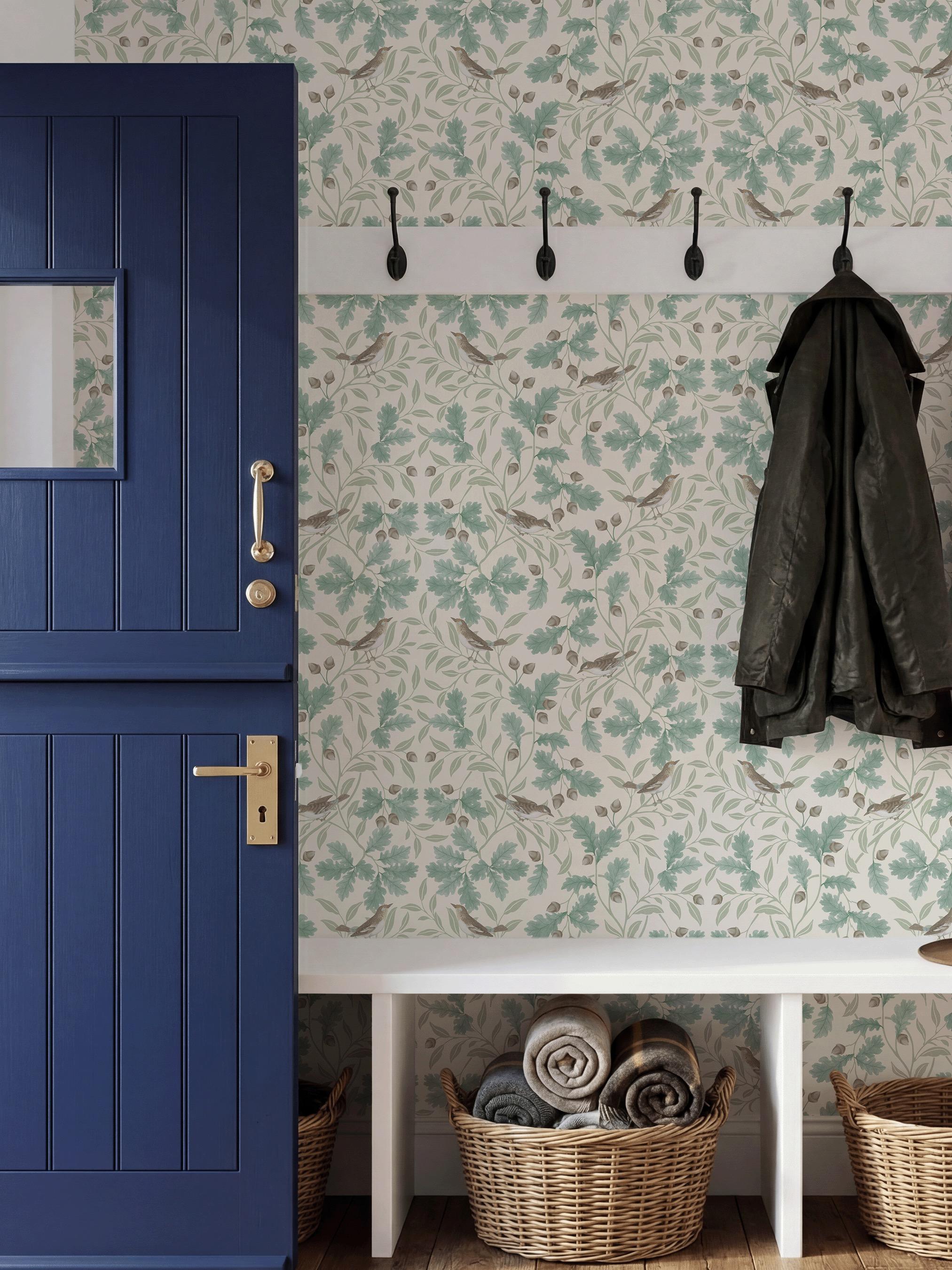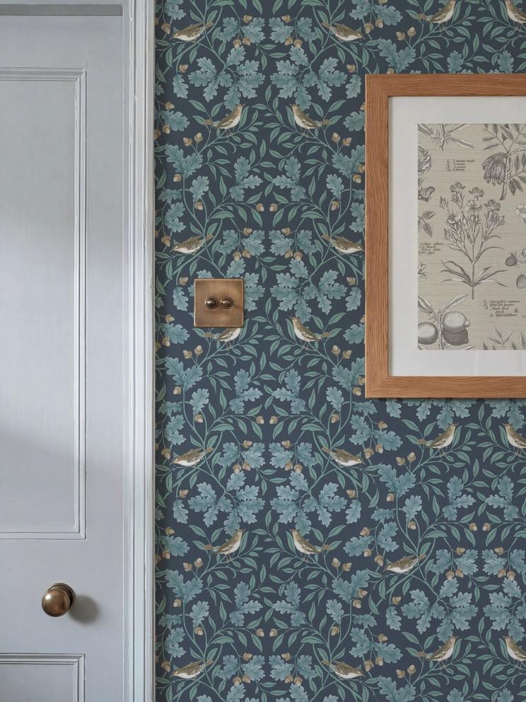 The RHS Woodland Songbirds Wallpaper showcases charming songbirds nestled amongst delicate branches. This enchanting design brings a touch of woodland magic indoors, creating a calming and sophisticated atmosphere.