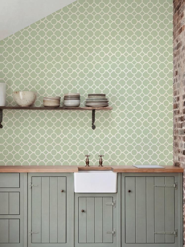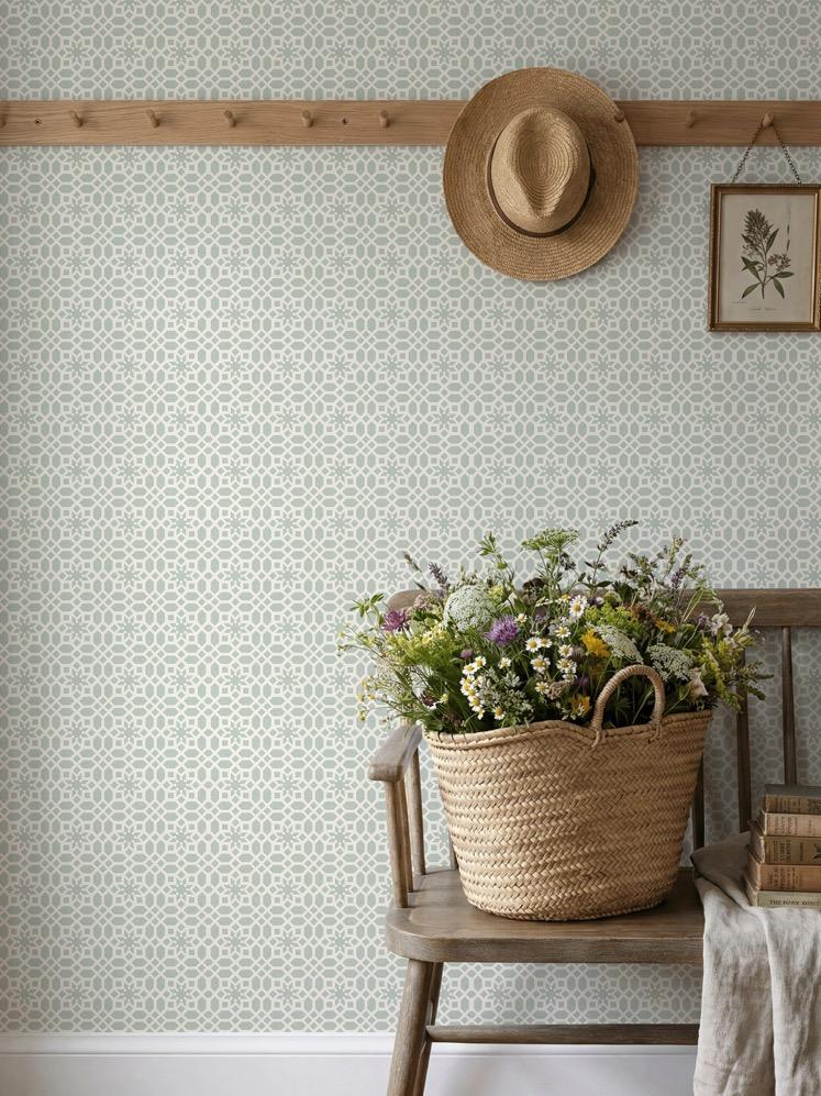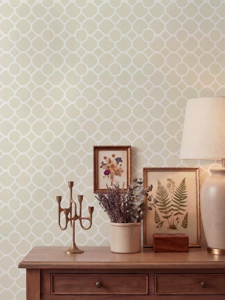 The RHS Lattice Fretwork Wallpaper features a contemporary geometric design inspired by traditional latticework. Its clean lines and neutral colours create a modern yet elegant feel, making it a versatile choice for any interior.