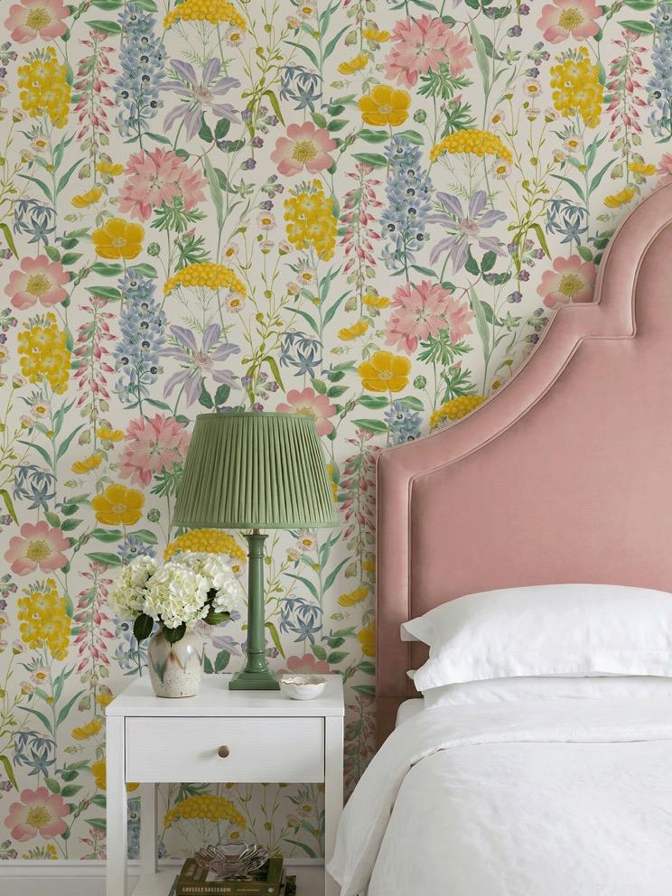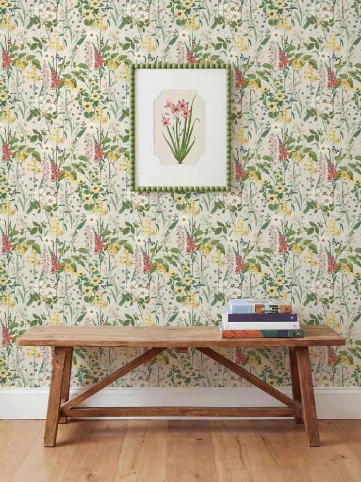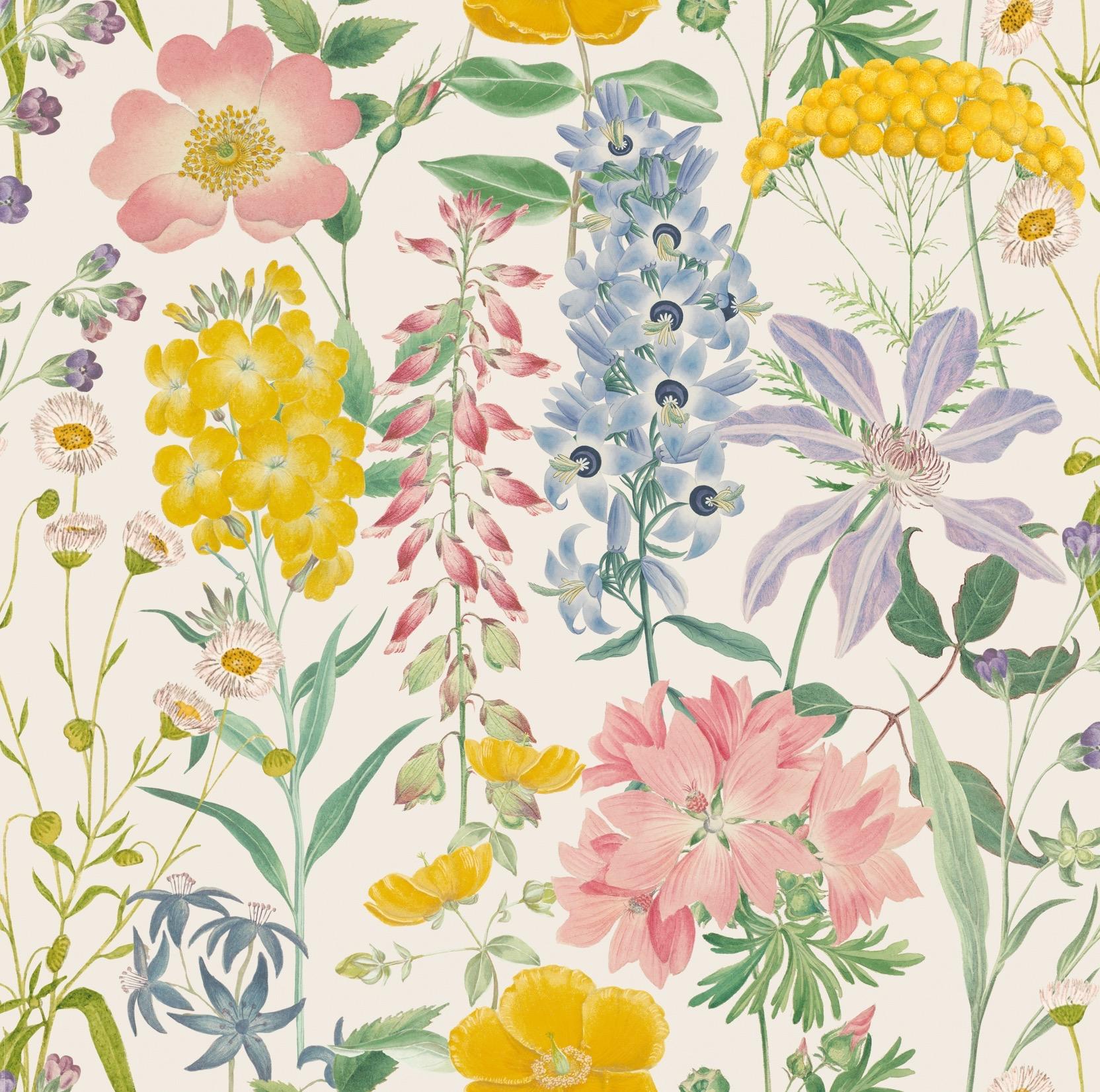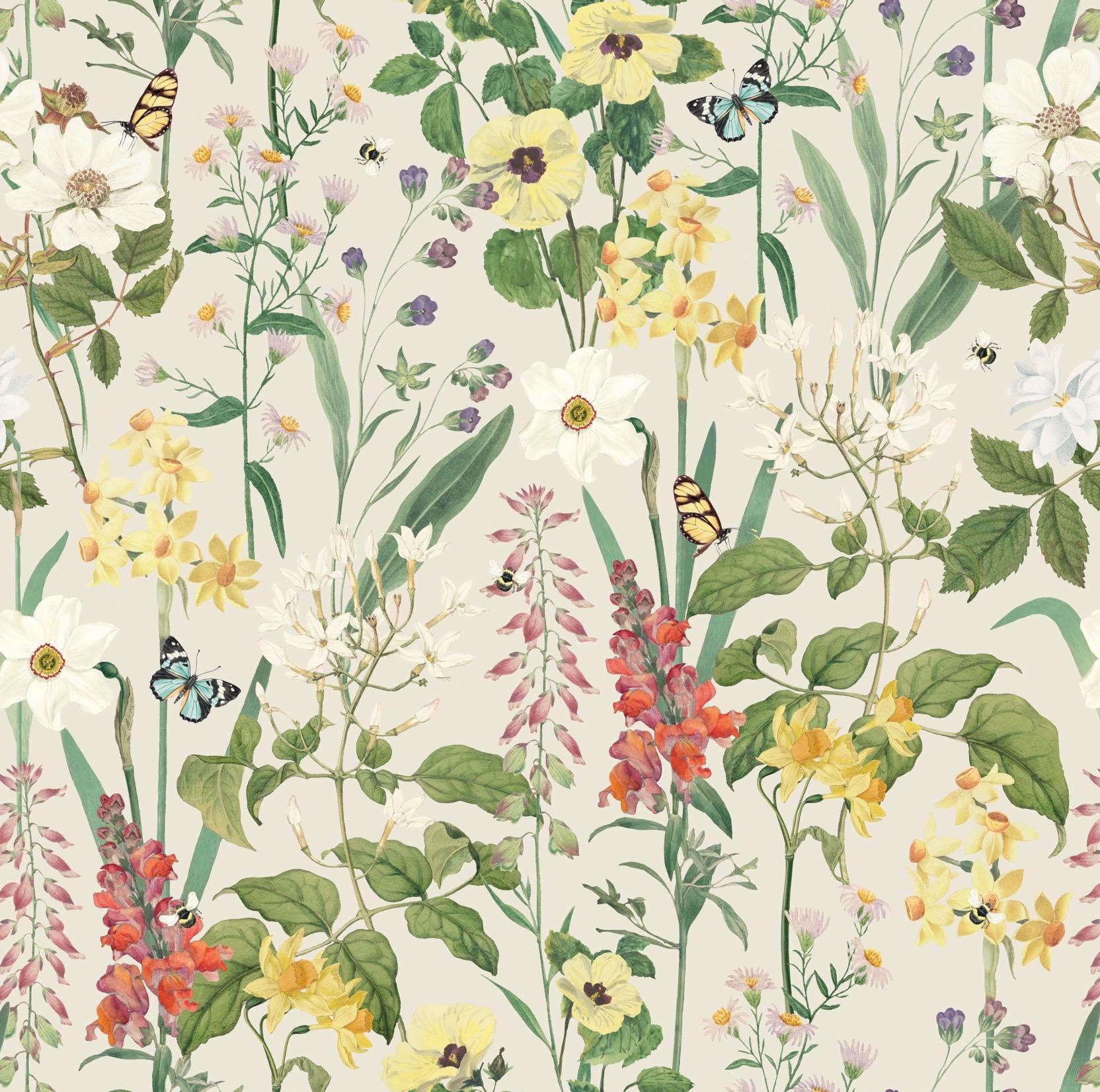 The RHS Country Garden Cream Wallpaper features a charming mix of garden flowers in vibrant hues, bringing the beauty of a British garden into any room. The cheerful display of daisies, clematis, and fresh blooms creates a warm and inviting atmosphere.