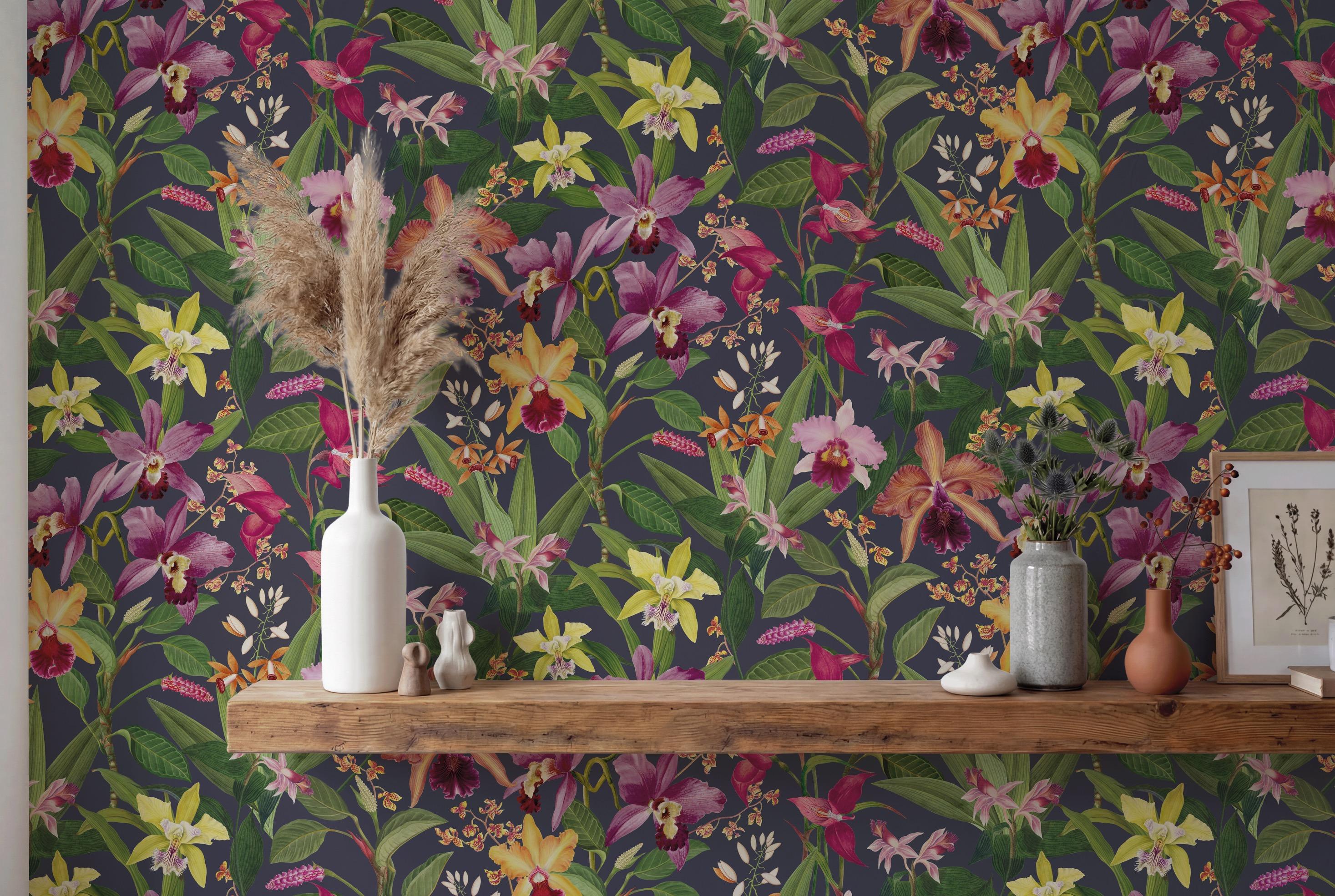 This RHS Orchid Botanical Purple Wallpaper showcases orchid illustrations on a striking purple backdrop, creating a captivating and elegant atmosphere. This design captures the delicate beauty and vibrant colours of orchids, bringing a touch of exotic charm to any interior.