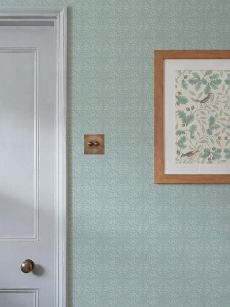 The RHS Star Trellis Wallpaper features a delicate star trellis pattern on a soft blue background. This versatile design adds a subtle touch of elegance and visual interest to any room, making it a perfect complement to bolder patterns in the collection.
