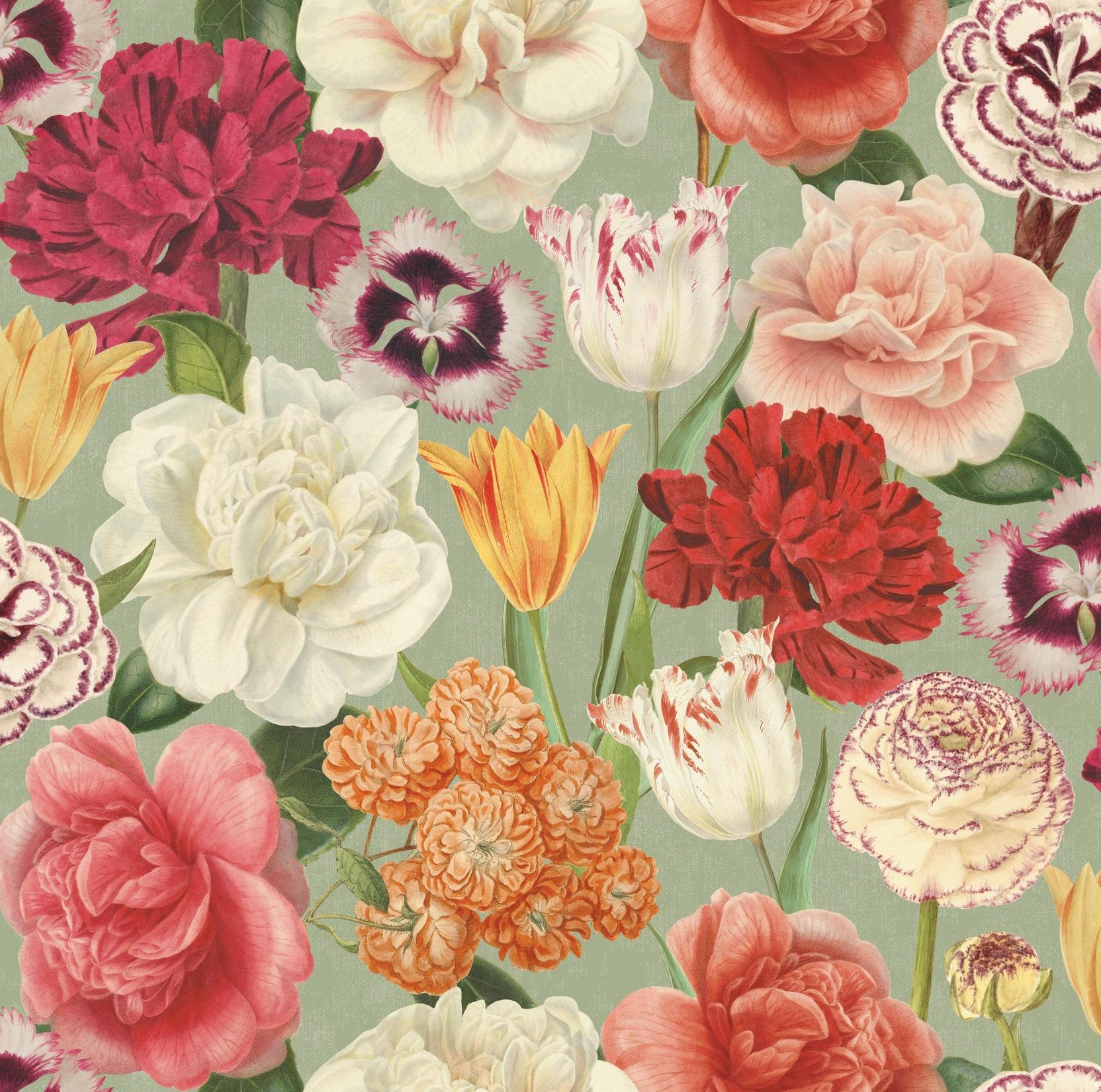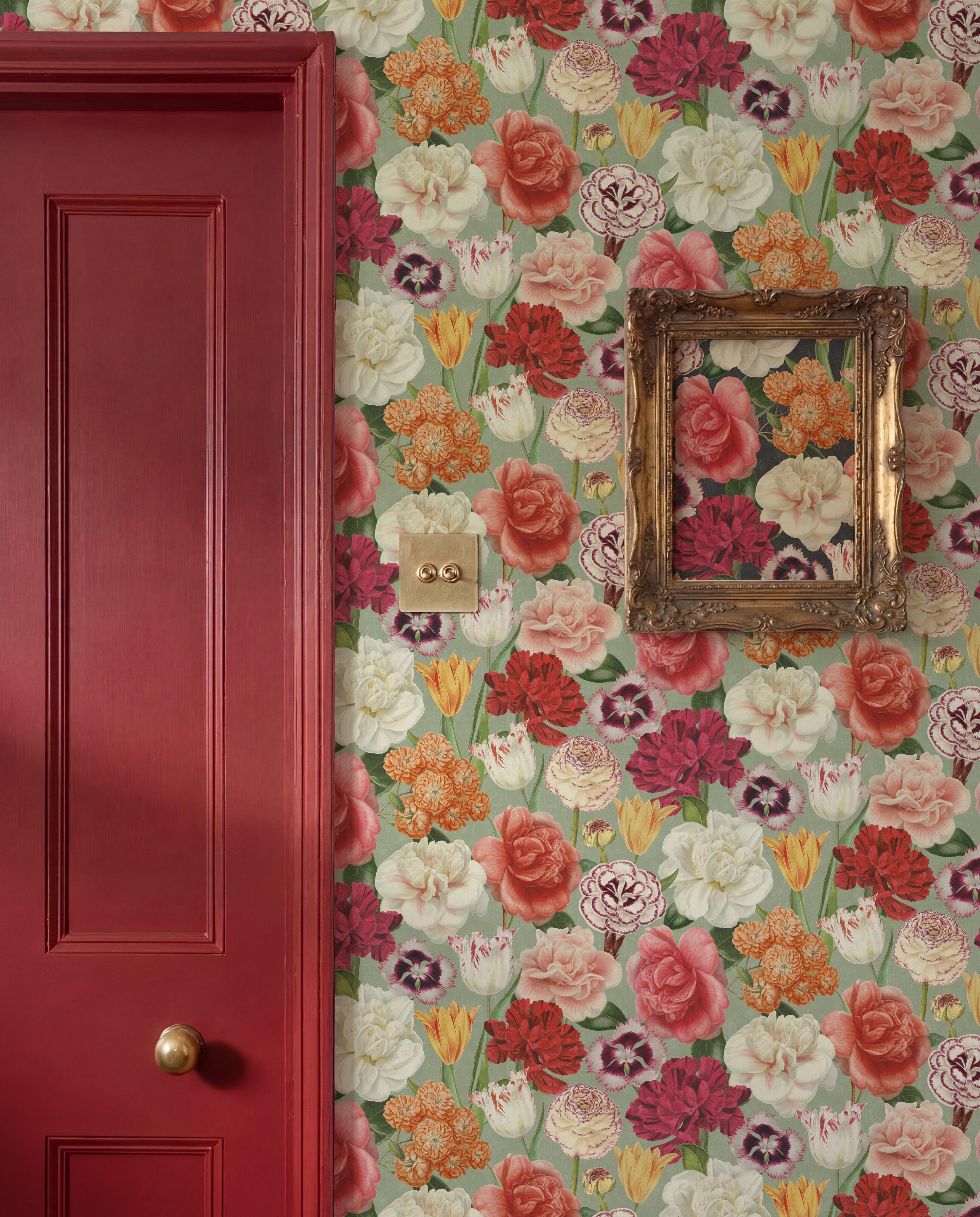 Inspired by the dramatic contrast of vibrant blooms against a bold backdrops, the RHS Blooming Bouquet Wallpaper showcases a medley of colourful peonies, dianthus with contrasting white camellias, creating a striking display of floral artistry