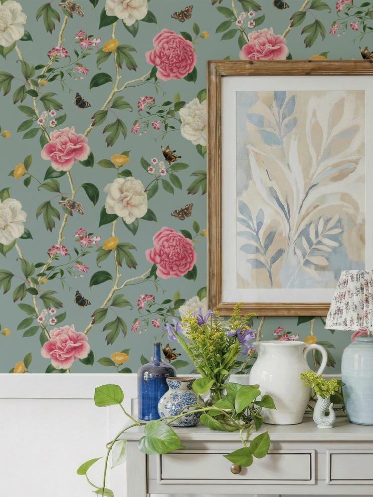 The RHS Chinoiserie Charmer Wallpaper features a vibrant Chinoiserie design on calming backgrounds, bringing a touch of exotic charm to any room. Inspired by traditional Chinese art, the intricate pattern depicts delicate floral motifs and graceful birds.