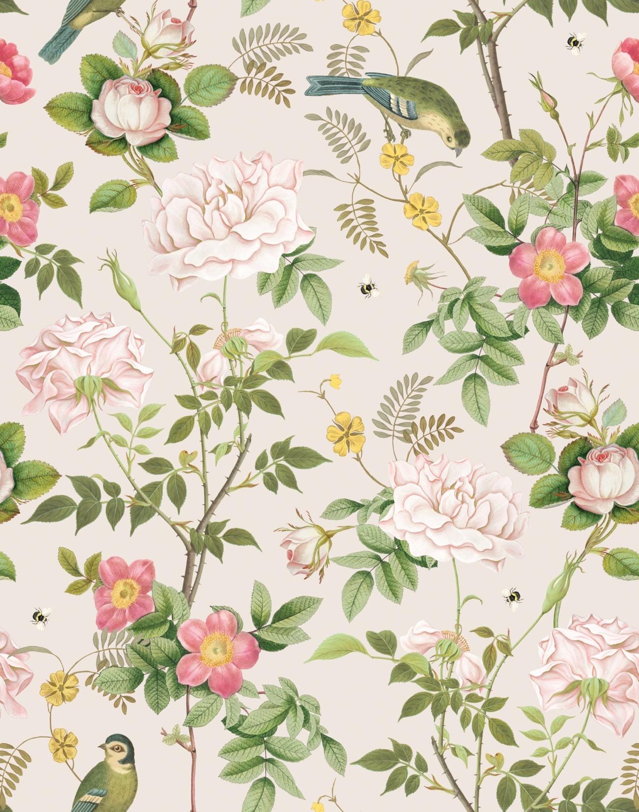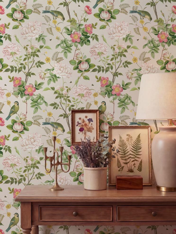 The RHS Birdsong & Blooms Cream Wallpaper features a delightful pattern of birds and blossoms on a soft cream background. This design creates a cheerful and inviting atmosphere, bringing the charm of a spring garden into your home.