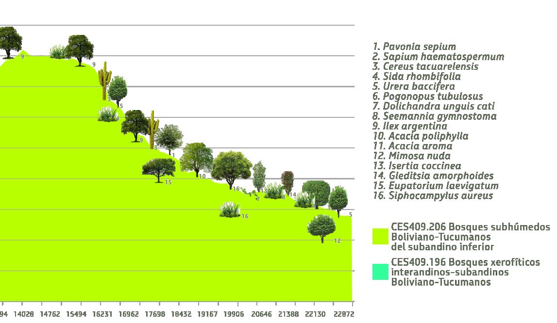 Bosque Boliviano Tucumano: El bosque tucumano-boliviano conforma la provincia biogeográfica de Yungas en las laderas orientales de los Andes con elevada diversidad de especies bajo un régimen climático subtropical.