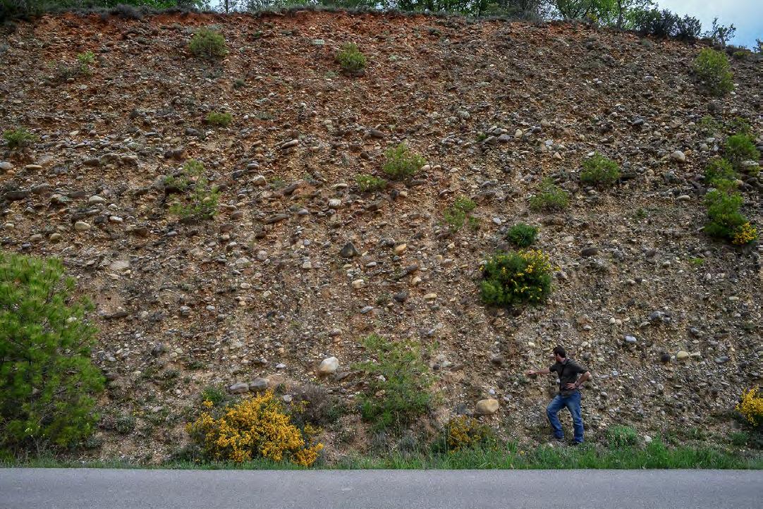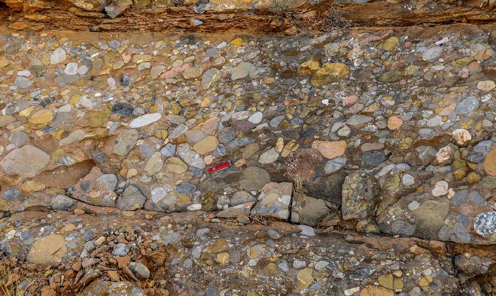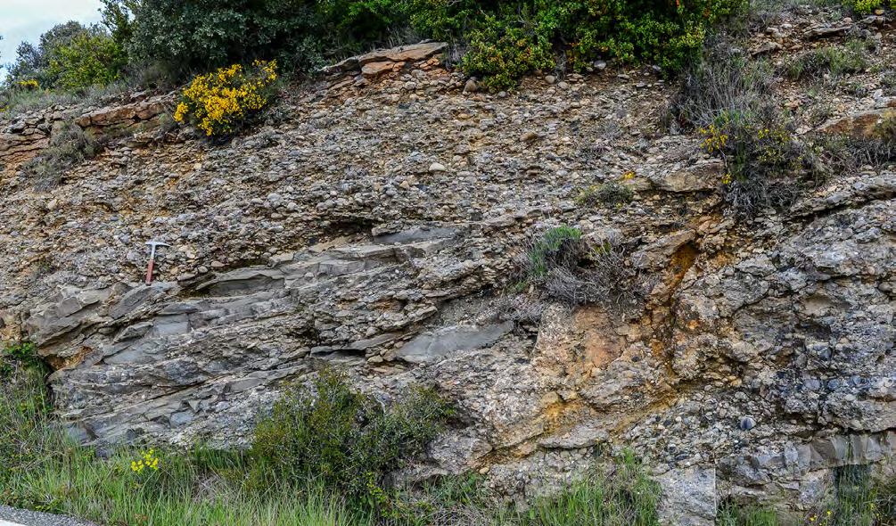 Graded, clast-supported conglomerate division comprising almost the entire thickness of the flood unit. Oligocene Ebro Basin, south central Pyrenees.