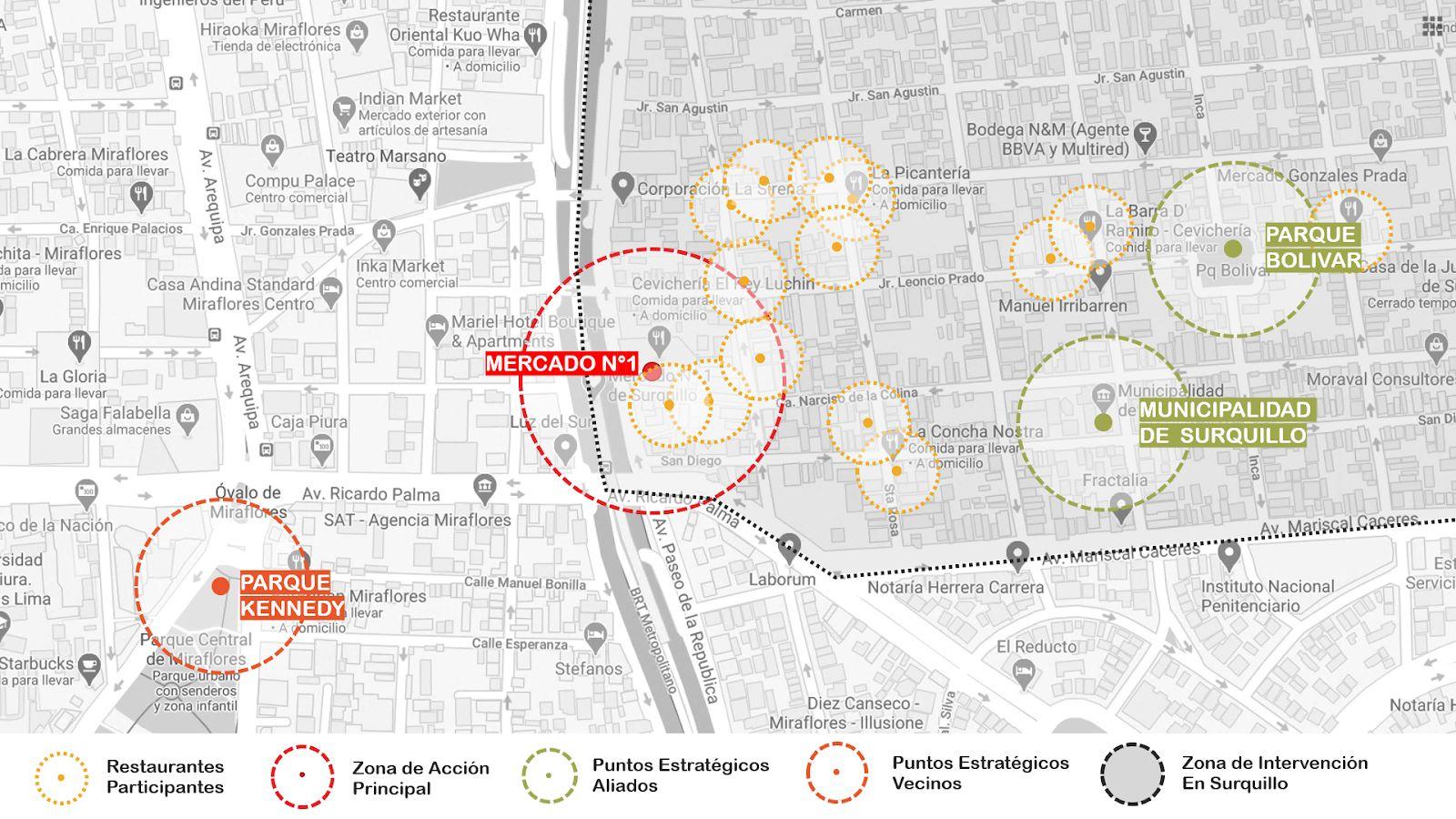 Se ha trabajado inicialmente con una macro-escala que involucra en su totalidad al distrito de Surquillo. Para eso, se desarrollaron sesiones de trabajo de gabinete y visitas de trabajo de campo, que definieron a Surquillo como un distrito histórico conocido por su estratégica ubicación en la ciudad de Lima Metropolitana y su creciente identidad barrial-gastronómica.
