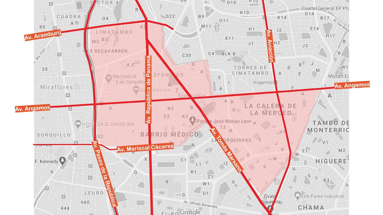 En la siguiente imagen se aprecia mapeada las avenidas límites de Surquillo que delimitan la escala macro y distrital del análisis realizado en las visitas de campo y recorridos Así mismo nos permite conocer las vías de acceso principales de nuestro público vecino que usa el distrito como uno de paso. Resaltando vías como: la Av. Aramburú, Av Aviación, Av Angamos, Av Paseo de la República, Av Tomás Marsano y Av Mariscal Cáceres