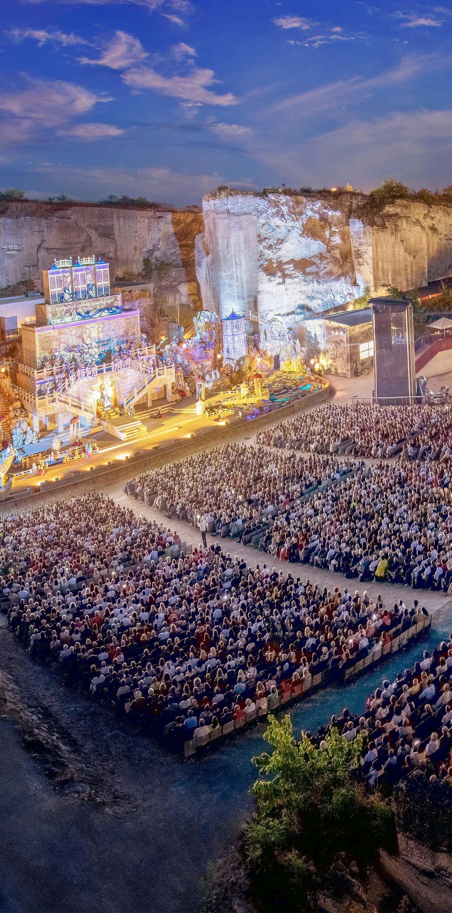 Boasting a stage area of over 7,000 m 2 and an imposing rocky backdrop, it counts among the largest – and most beautiful –open-air arenas in Europe today. The quarry continues to enchant visitors with its combination of natural and manmade architecture. Outstanding stage directors and the great singers of our time have created unforgettable, inspiring opera performances in this impressive setting since 1996, attracting not only opera lovers from all over the world, but also a diverse, discerning audience eager for new experiences.