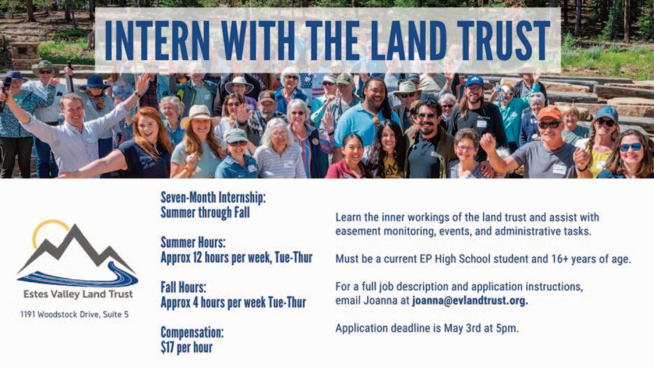 Seasonal: May-October Full-time or Part-time Weekends & some holidays required in Estes Park Visitor Center & Rocky Mountain National Park Seeking team players to work at Experience with marketing or sales a plus | Customer service experience required See full position description on our website RMConservancy.org/employment | (970)586-0121 NOW HIRING! Warehouse & Warehouse-Driver Rocky Mountain Conservancy Retail Warehouse $20-20.50/hr Seasonal: May-October Full-time or Part-time Weekends & some holidays required in Rocky Mountain National Park Seeking team players to work at See full position description on our website RMConservancy.org/employment | (970)586-0121 SeasonalGuest Services Lodge Position Apply via email with resume to events@twinowls.net Experience Required 32 hours a week Starting at $18 hour Now Hiring Full Time Guest Services Associate$21 Per Hour Maintenance Technician I$18.61 Per Hour Maintenance Technician II$20.75 Per Hour Generous Paid Time Off + Full Benefits Part Time Laundry - $16 Per Hour Apply careers.travelandleisureco.com (search for Estes Park) Resumes to marlene.saleeby@wyn.com MORE EMPLOYMENT ADS ON PAGE 42