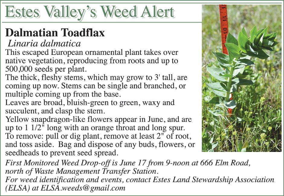 The Estes Land Stewardship Association (ELSA) has been serving the Estes Valley for over 16 years in promoting good land stewardship, weed identification and education, and free educational materials including the most popular Twenty Ob-Noxious Weeds in the Estes Valley Identification and Management Guide. Now is the time to remove mature noxious weeds that contain seeds that will be next year’s -- and many more years -- weeds. The first Monitored Weed Drop-off will be held Saturday, June 17 from 9:00 a.m. to noon located north of the Waste Management transfer station at 666 Elm Road. No early birds or illegal drop-offs; the gate will be closed until the 9:00 a.m start. Do not block the driveway entrance shared with recycling. The line will form up-the-hill/north of the entrance on the east-side of Elm Road. Estes Land Stewardship Association (ELSA) volunteers will be on hand to answer weed questions at-a-distance and direct traffic flow. You will unload your paper yard bags into the dumpster or truck. We have limited dumpster capacity, so a maximum ten paper yard bag limit will be imposed – no plastic bags. When we are at full capacity, the drop-off will end. Noxious weeds only, not native plants! No slash, pine needles, pine cones, trash, yard waste or dirt! Please remove/shake off dirt from plant roots. Excessive weight of wet weeds and dirt is a safety hazard for our volunteers. Bag flowers and seed heads rather than entire plants. Read our weekly Estes Valley’s Weed Alert articles (published April through September) to help identify invasive plants and manage