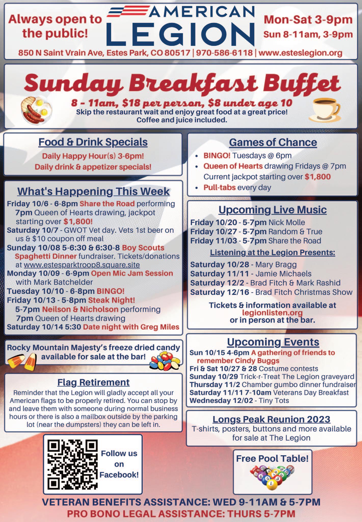 The Aviation Club meeting is Wednesday, October 11, at 6:30 p.m., at the American Legion Post 119 hall, located at 850 No. St. Vrain Ave. As always, the Legion is open to the public with food and drink for purchase. The gathering is open to all interested, so if you like flying, planes, space, or just talking to aviation enthusiasts, come join us!