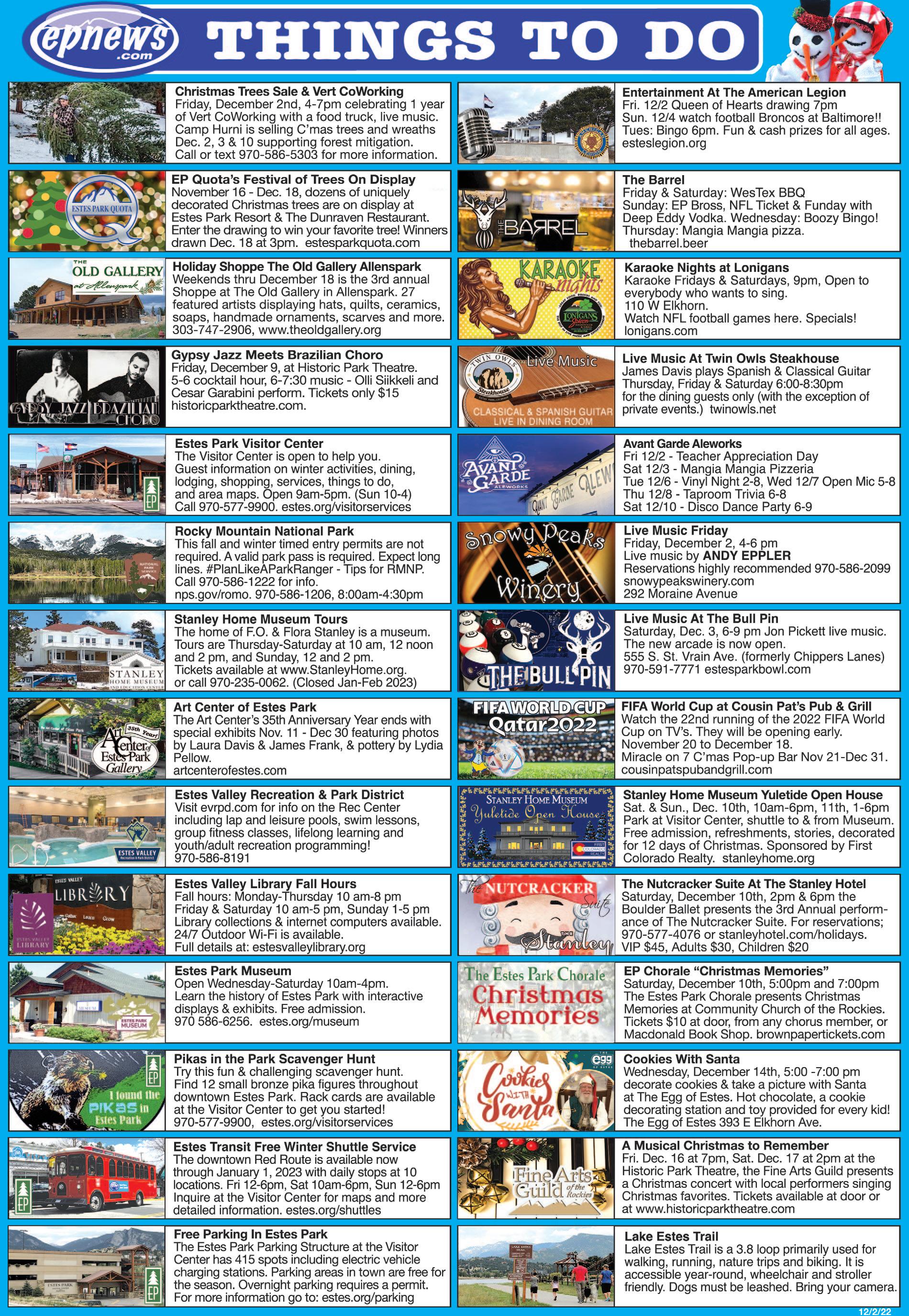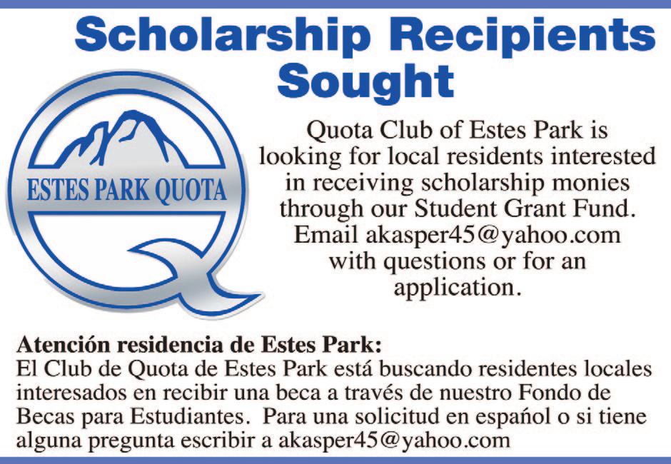 Generous Sponsors – the Antiquari ans, Colorado Homestead, Dunraven Restaurant, The Enchanted Florist, Estes Park News, Kind Coffee, Longhorn Liquors, Macdonald Book Shop, Moun tain Home Café, Peaks Hallmark Card Shop, Rocky Mountain Chocolate Fac tory, Snowy Peaks Winery, Smith Sign Studio, Wynbrier Ltd. Wildlife Gallery and the YMCA of the Rockies