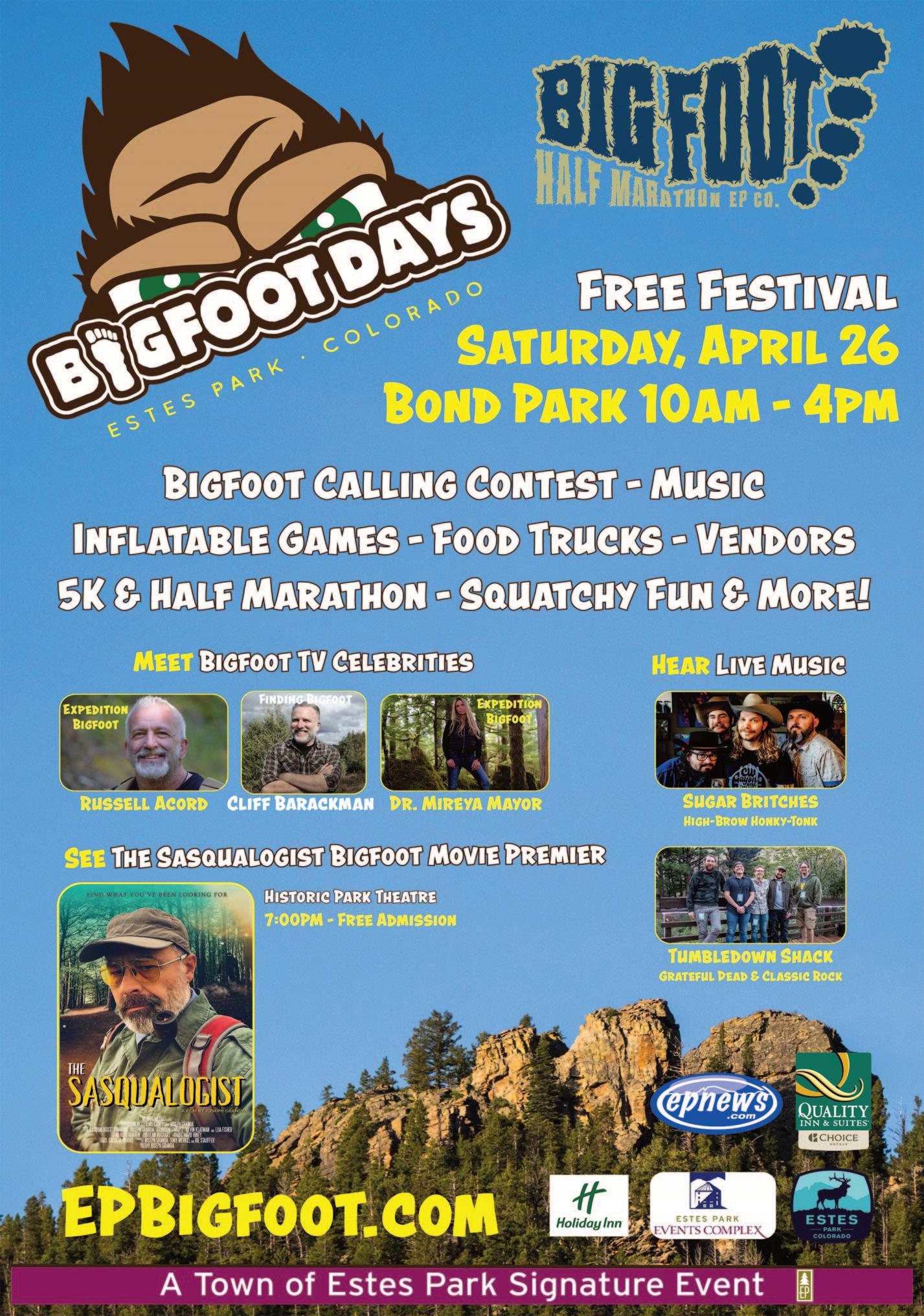 Estes Park Bigfoot Days returns celebrating all things Squatchy. The weekend kicks-off with a ticketed dinner at the Holiday Inn on Friday, April 25 with Bigfoot Television Celebrities, continues with a free festival in Bond Park on Saturday, April 26 from 10 a.m. to 4 p.m., and concludes with a Saturday evening Sasquatch movie premiere at the Historic Park theatre at 7 p.m. The festival includes talks from the Bigfoot TV Celebrities, the Sasquatch Outpost podcast, live music, inflatable games, craft and food vendors, a Bigfoot calling contest, Bigfoot sighting stories, a short documentary film, a Bigfoot TV series premier and much more!