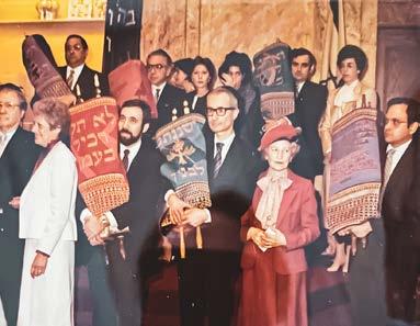 34 Photo includes Lionel Etra and his mother, Reba; Rabbi Dale Polakoff; Bob Kurzweil, Helen Nash; and Norman Bulow. Each Torah cover represents different mitzvot.