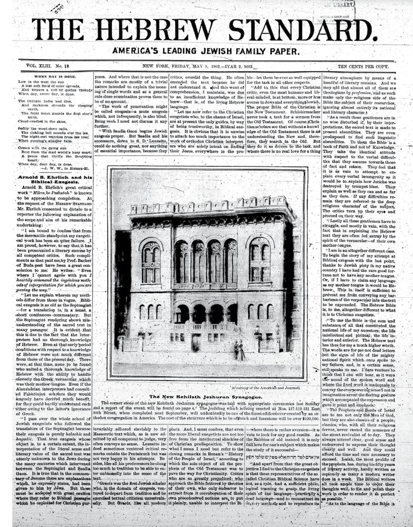 3 “The New Kehilath Jeshurun Synagogue,” The Hebrew Standard, May 9, 1902.