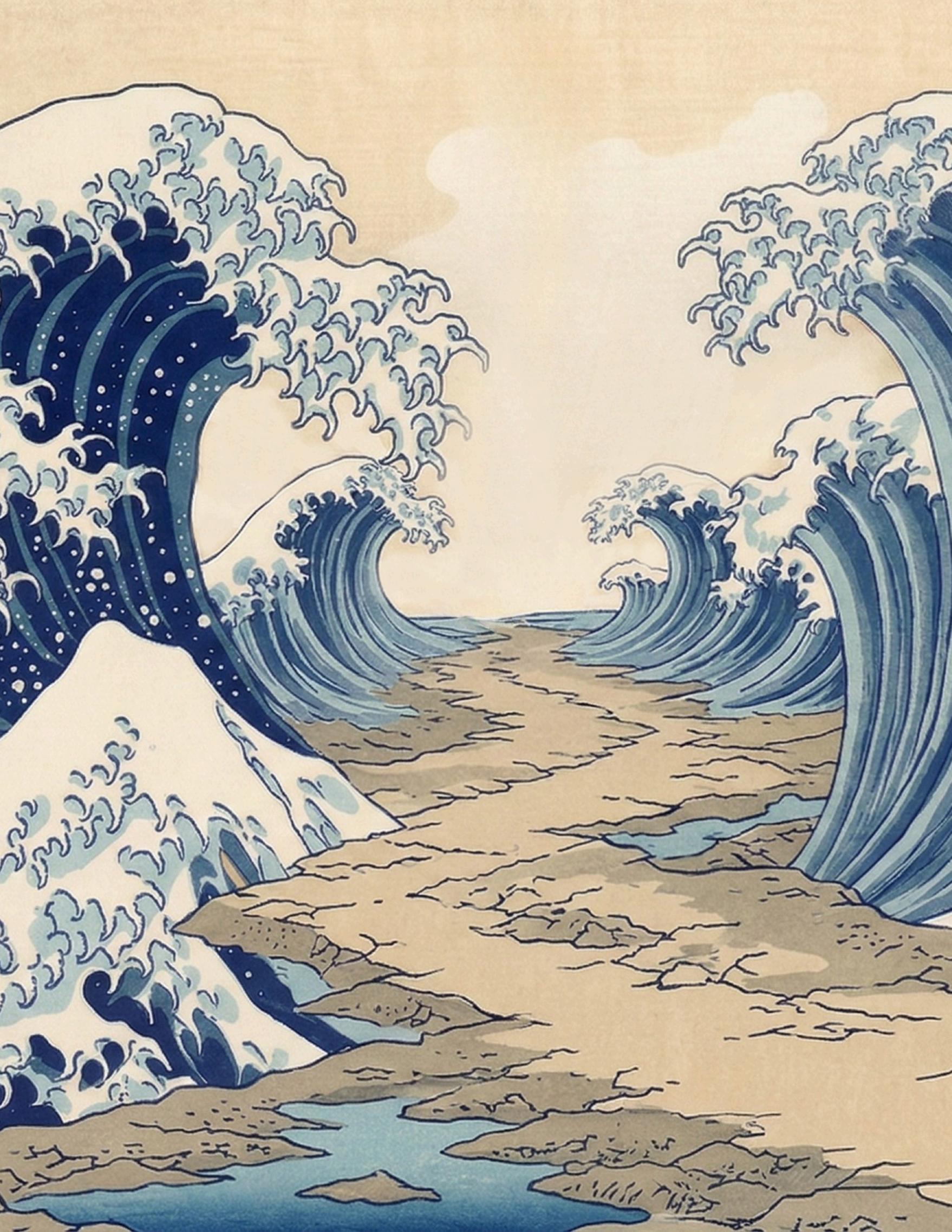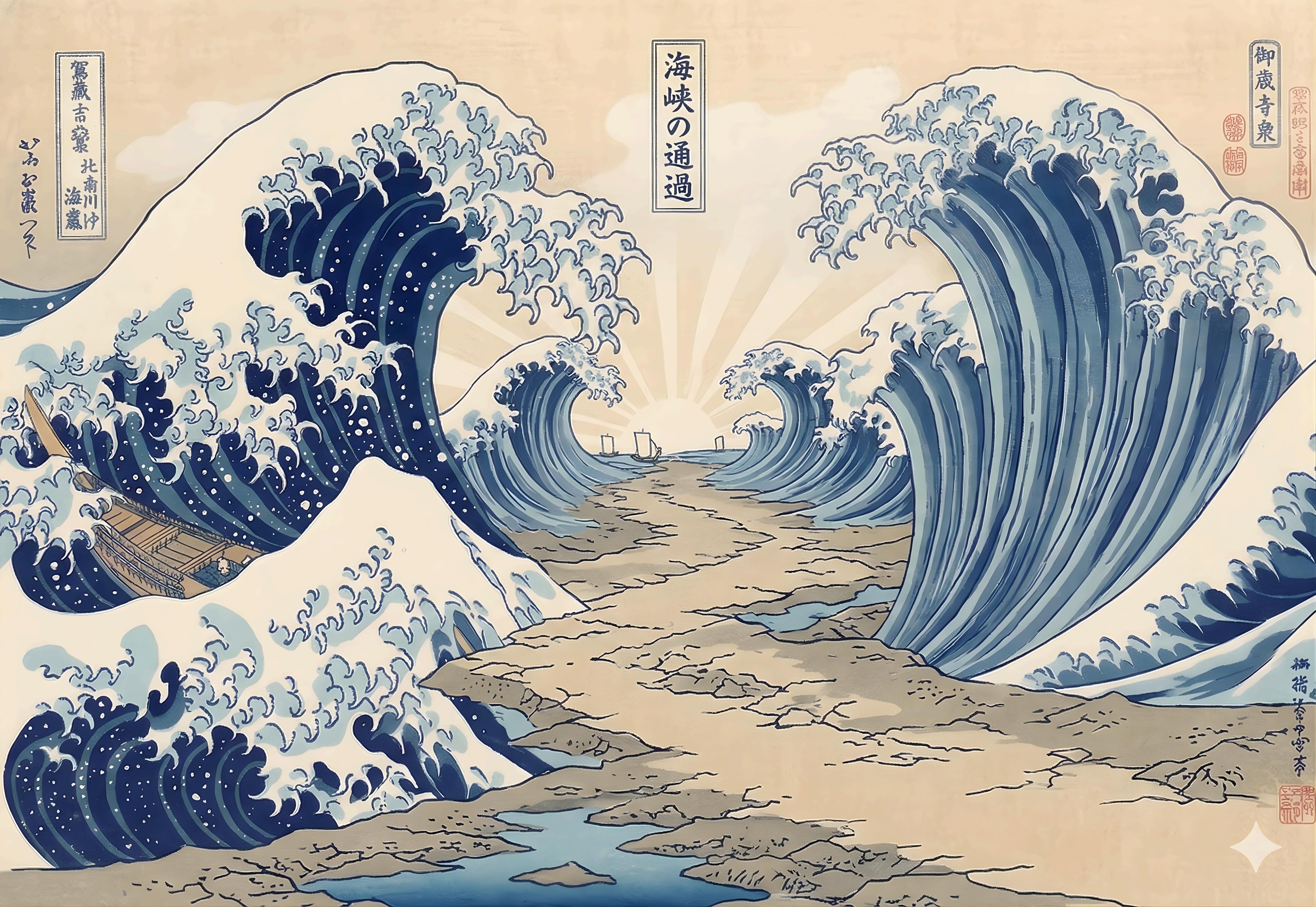 The kriyat yam suf scene on this bulletin’scoverisinspiredbyKatsushika Hokusai’ s “The Great Wave off Kanagawa”woodblockprint,originally createdin1831.