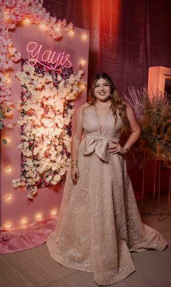 La decoración, en tonos rosas, junto a varias pantallas, ambientaron el lugar de forma espectacular. Yayis lució un hermoso vestido y fue maquillada por Esteban Galindo, realzando su belleza natural. Una banda en vivo amenizó la noche, llenando de alegría y música el ambiente. Fue una noche memorable, llena de amor y orgullo por el gran logro de Yayis.
