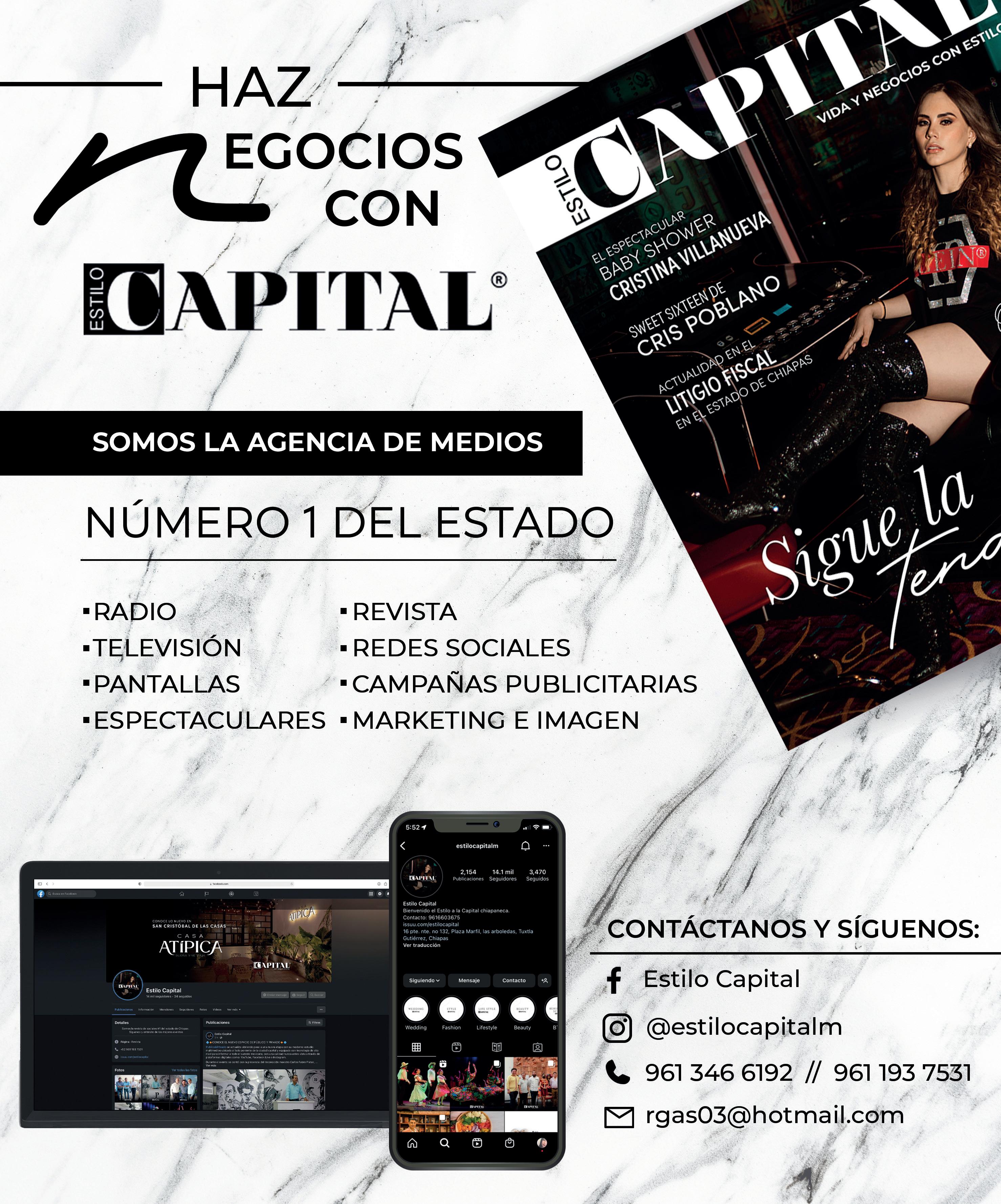 ESTILO CAPITAL, con domicilio en Calle 16A. Pte. Nte. No.132, Las Arboledas, 29030, Plaza Marfil, local 7 en la Ciudad de Tuxtla Gutiérrez, capital del estado de Chiapas, utilizará sus datos personales aquí recabados para proveer los servicios y productos requeridos por usted, informar sobre cambios o nuevos productos. Para mayor información acerca del tratamiento y de los derechos que puede hacer valer, usted puede acceder al aviso de privacidad completo a través de: www.cinvees. mx/aviso_completo.docx Estilo Capital es una publicación mensual de distribución gratuita con registro en trámite ante Gobernación, publicada por Estilo Capital. El contenido de los artículos es responsabilidad de los autores.