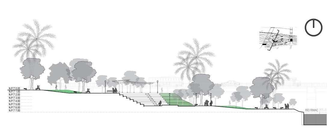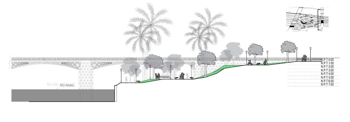 Se recupera el espacio publico de la ribera del rio Rimac, adaptandose a la topografia e hidrologia inmediata. “