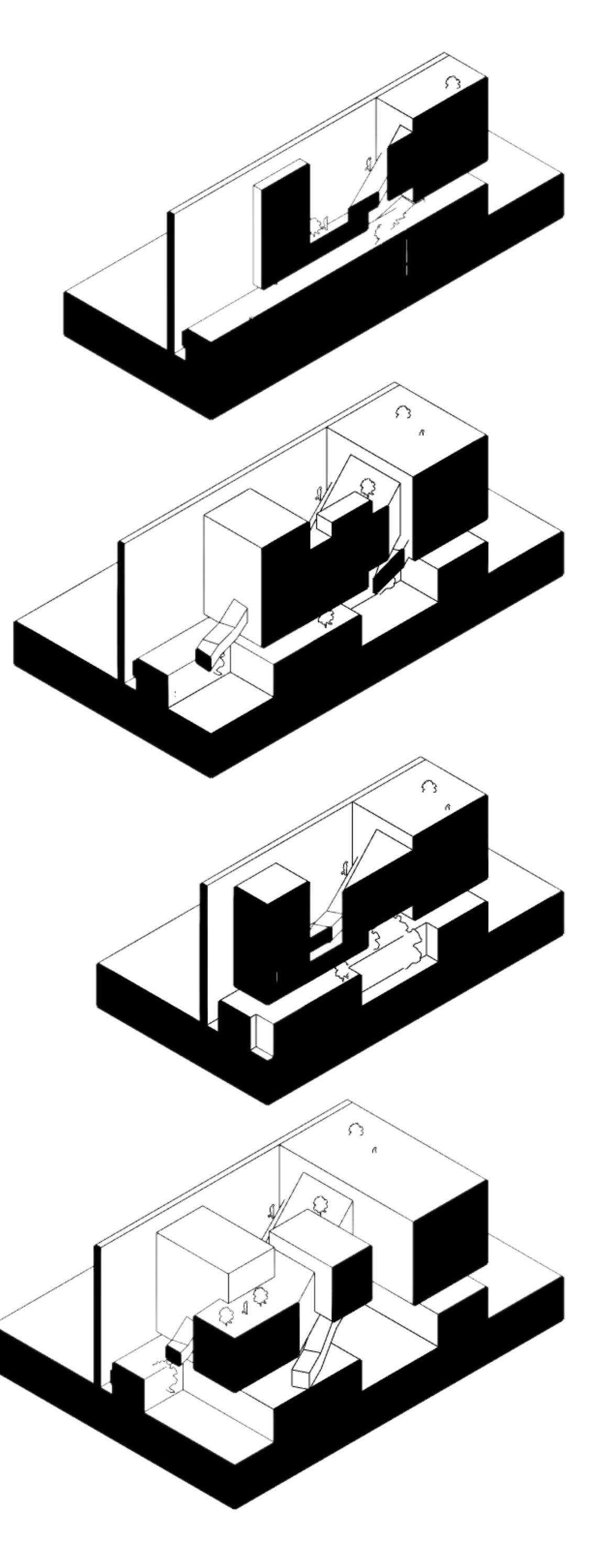 La exploración descompone en su forma mas básica los elementos y principios ordenadores del referente CHL para plantear de manera coherente una propuesta que eleve el diseño a un nivel de centro cultural. Para ello es necesario pensar en volumetría y corte que formen la espacialidad.