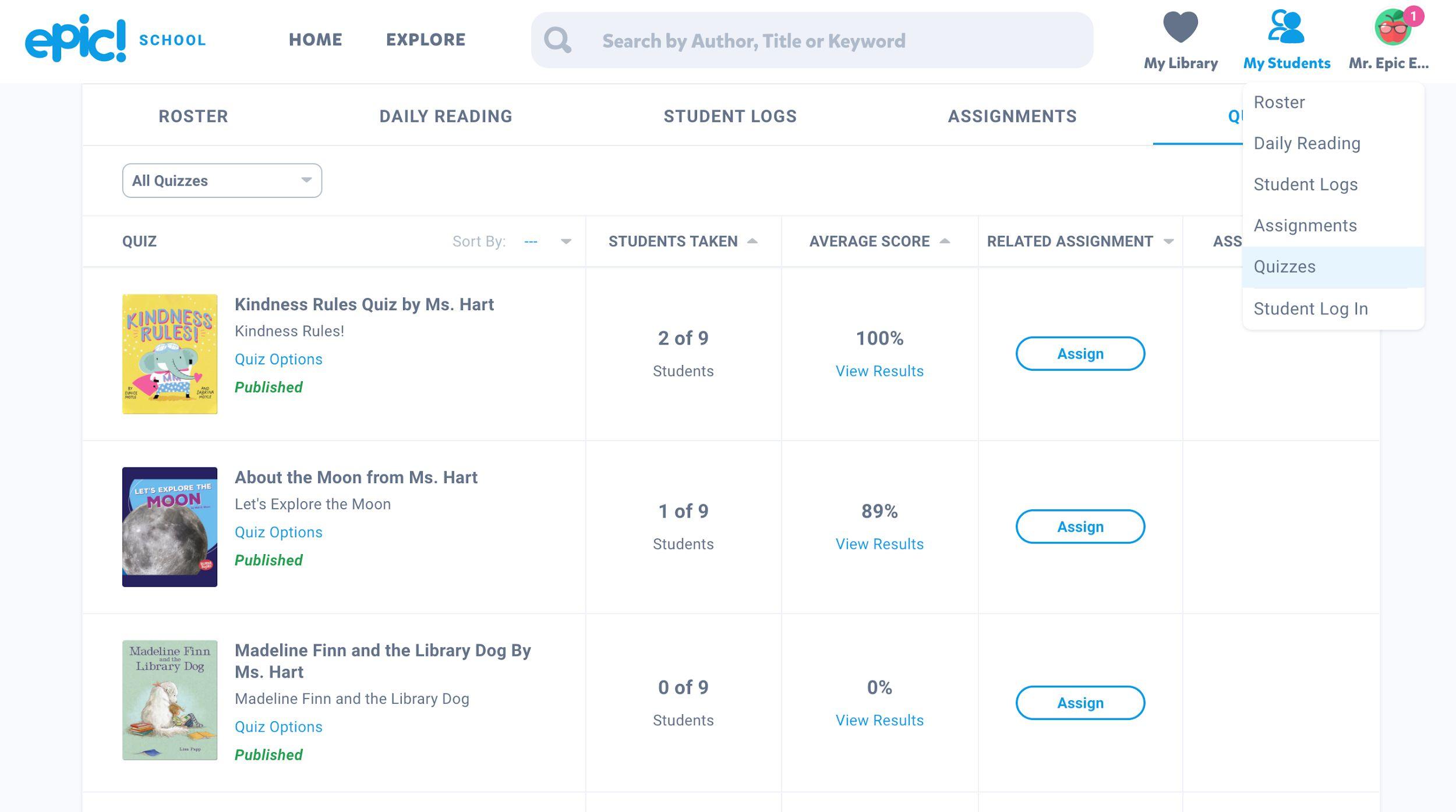 ● Make Epic a part of your students’ learning at home by assigning books and quizzes for homework.