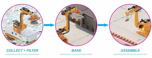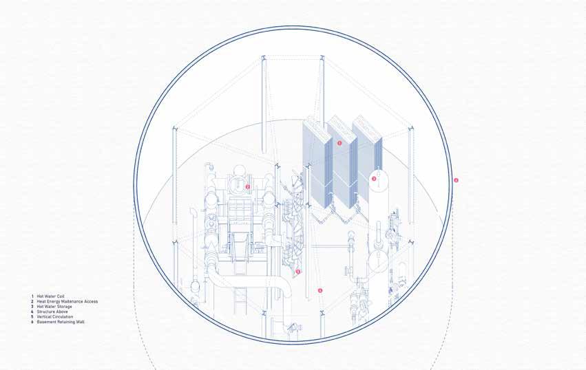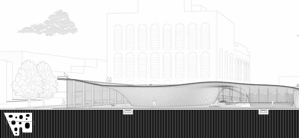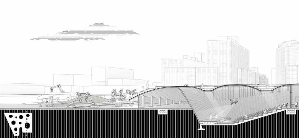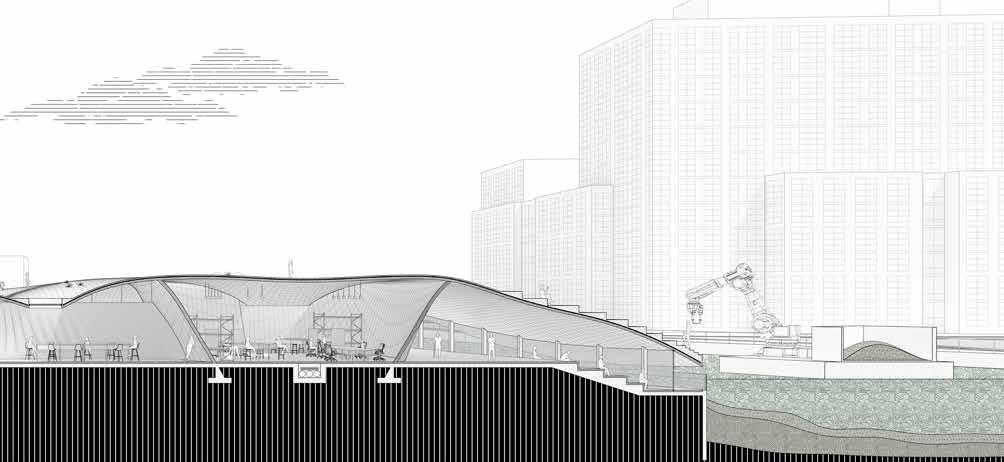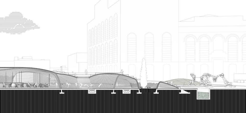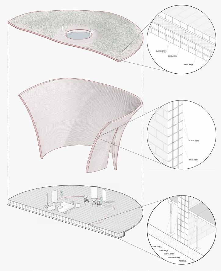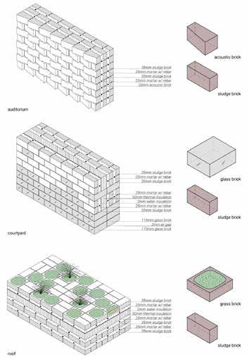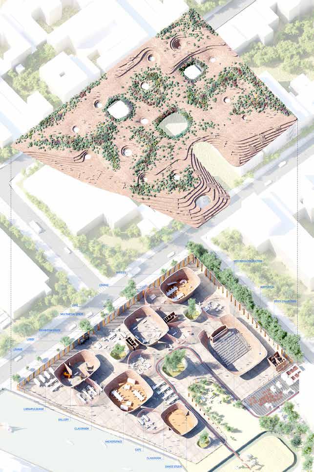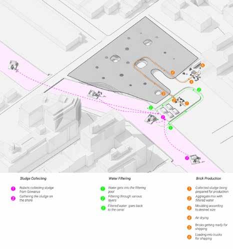 Intended to house three different cultural institutions focused on different mediums (art, theater, and fabrication), the structure uses the necessary structural drop downs of the brick vaults as permanently occupied rooms, while leaving the remaining space as semiprogrammed flex areas meant to promote collaboration between mediums. These transformable spaces are flanked by optional curtains that can be deployed when further privacy is needed. Special variations of the sludge brick are incorporated into the structure when necessary, such as glass bricks that allow light within the space, acoustic bricks that insulate sound sensitive areas, and grass bricks which allow the roof to grow wild with vegetation. Along the interior is a brick production line which is constantly operating, as canal-faring robots extract and process sludge for the creation of bricks to be sold as a means of funding for the cultural institutions the building serves.