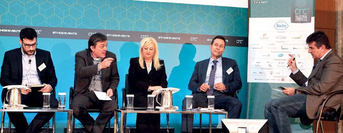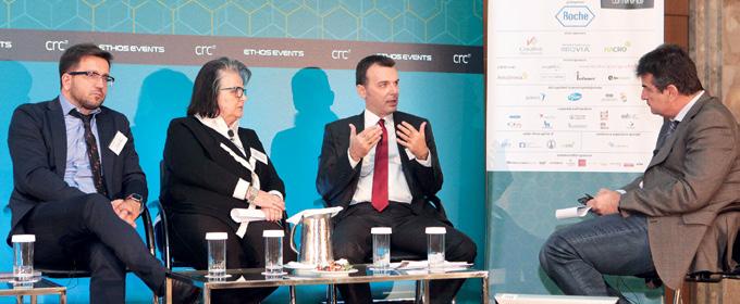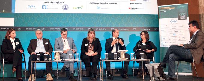 Από αριστερά: Κοράκη Ευαγγελία, Πρόεδρος, Hellenic Association of CROs & Managing Director, Coronis Research SA, Γρηγόριος Β. Σιβολαπένκο, Αν. Καθηγητής, Δ/ντής Εργαστ. Φαρμακοκινητικής, Τμήμα Φαρμακευτικής, Πανεπιστήμιο Πατρών, Νίκος Δέδες, Πρόεδρος, European AIDS Treatment Group, Τίνα Ανταχοπούλου, Medical Director, Medical Department, AbbVie Pharmaceuticals, Σωκράτης Κουλούρης, MD, Ιατρικός Διευθυντής, Roche Hellas, Ευγενία Φούζα-Σταυροπούλου, Αν. Προϊσταμένη, Δ/νση Φαρμακευτικών Μελετών και Έρευνας, ΕΟΦ