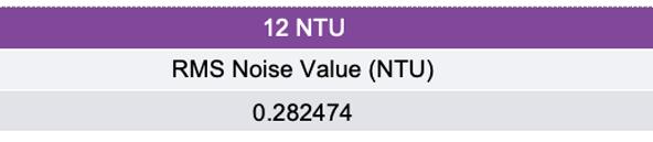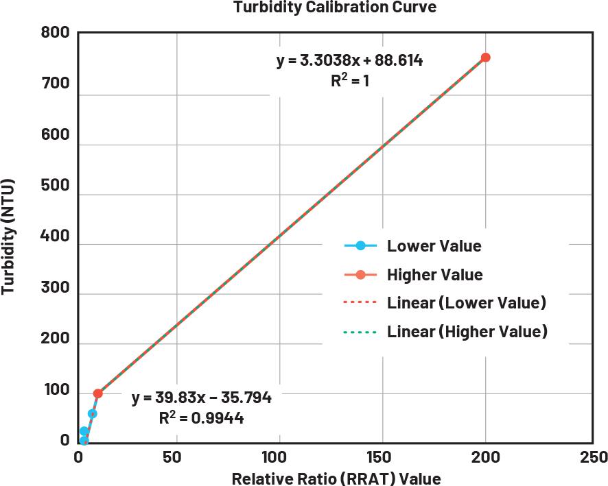 The response curve was split into two sections because the 90° scattering measurement is less responsive to high turbidities. One section represents lower turbidity (0 NTU to 100 NTU), and the other higher turbidity (100 NTU to 750 NTU). Two linear fits were then made to each section. Even though there are now two equation values, the CN0503 can still be used to quickly show resulting NTU values. This is