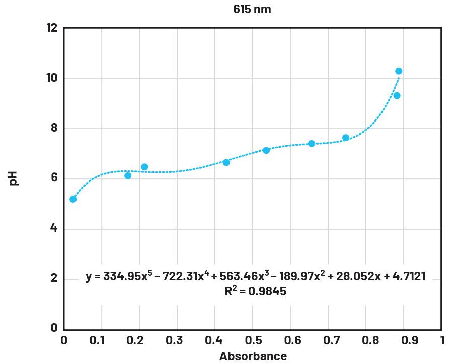 In each case, the pH vs. absorbance was plotted to create the calibration curve. The Add Trendline option is then used to get an equation for the curve. The equations are then used to determine concentrations of unknown samples. The sensor output is the x-variable, and the resulting y-value is the pH. This can be done by hand; however, the CN0503 can also be used for this. The firmware implements two fifth-order polynomials, INS1 and INS2. Once the polynomials are stored, the INS1 or INS2 mode can be selected so that measurement