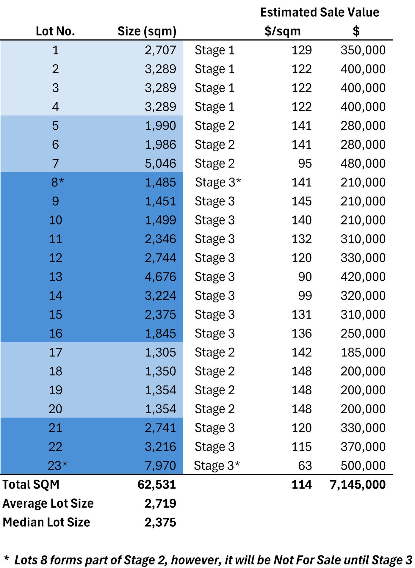 Based on recent sales and current market conditions we estimate the likely sales value of the various lots as follows: