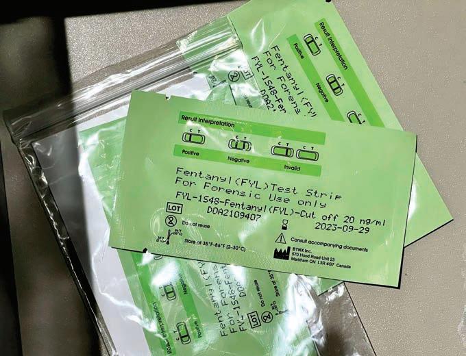 e standard protocol to test a batch of drugs for fentanyl involves dissolv ing a small amount of the drug in water and dipping a detection strip into it for 15 seconds. e strip then is placed on a at surface for ve minutes, when colored lines will indicate whether or not fentanyl is present. Typically, one line indicates that there is fentanyl in the drug and two lines means there isn’t, but packaging will show instruc tions and how to determine if the test was valid.