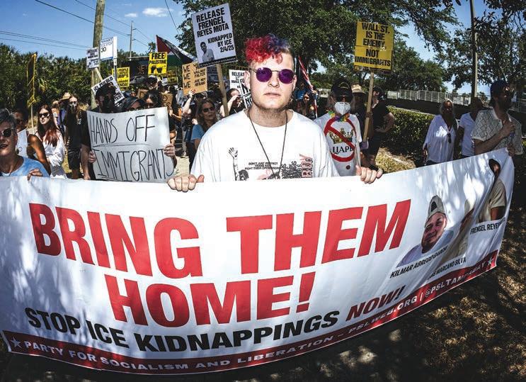 Families of Frengel Reyes, 24, and Luis Marcano Silva, 26, said they were wrongly deported to an El Salvadorian prison in February. Protesters in Cypress Point Park outside the Tampa ICE office held signs with their photos saying “Bring Them Home.” The protest was part of several local rallies and hundreds of nationwide events for 50501—”50 states, 50 protests, 1 movement.” Tampa joined St. Petersburg, Clearwater, Zephyrhills, Sarasota and Spring Hill in events organized by PSL Tampa Bay, Pinellas DSA and ANSWER Suncoast.