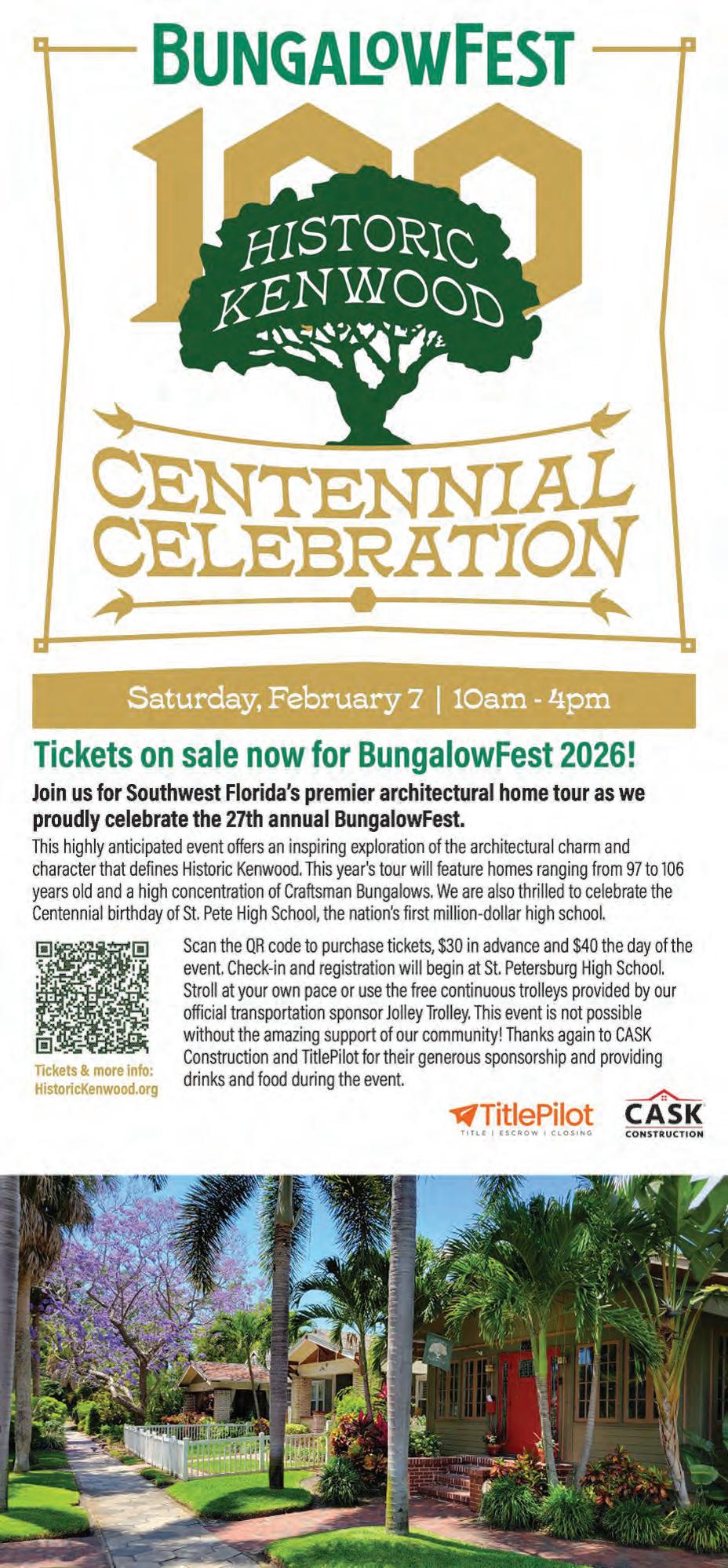 Log off of Zillow and meet the people who own some of the most coveted cozy homes in Tampa Bay. The Historic Kenwood Neighborhood Association has been running BungalowFest for nearly three decades, highlighting the area’s charming homes. The houses open for touring are all around 100 years old, mostly consisting of Craftsman Bungalows. Just as important as the architecture is the celebration of residents’ creative decorations and design. This year’s tour also marks St. Pete High School’s centennial birthday as the nation’s first million dollar high school. The tour starts there, then attendees can stroll at their own pace or hop on Jolley Trolleys. BungalowFest: Saturday, Feb. 7. 10 a.m.-4 p.m. $30-40. St. Petersburg High School, 2501 5th Ave. N, St. Petersburg. historickenwood.org—Selene San Felice