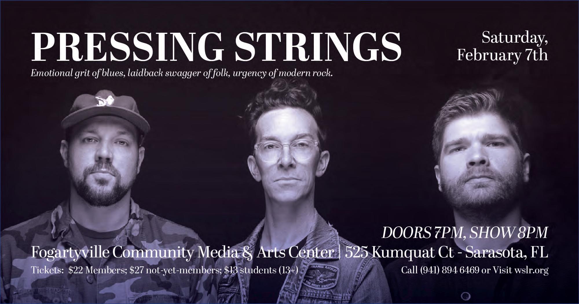 Pressing Strings For fans of bands like The Head and the Heart (“Blood To Me”) and even Dawes (“Bit Of Belief”), Jordan Sokel, Nick Welker and Justin Kruger—AKA Pressing Strings—play earnest, deeply harmonious folk-pop that plays like a balm to our stimuli-ridden day-to-day . 8 p.m. $13 & up. Fogartyville Community Media & Arts Center, Sarasota