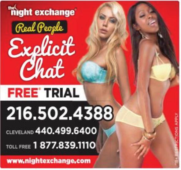 | clevescene.com | November 2-15, 202242 CARING MASSAGE Days & Evenings, weekends. Warm candlelight atmosphere. Lakewood/West Suburbs Linda 216-221-5935 Massage - Certified Phone Lines EXPLICIT CHAT WITH SEXY LOCALS Get your FREE TRIAL! 18+ CALL The Night Exchange NOW! 216.502.4388 / 440.499.6400 www.nightexchange.com HOT LOCAL URBAN SINGLES! Are looking to hook up now! Try it FREE! 18+ 216.367.1010 / 440.424.0303 www.metrovibechatline.com CALL NOW, MEET TONIGHT! FREE to try! 18+ 216.626.7777 / 440.325.7777 Other Cities: 1.888.257.5757 www.questchat.com 100’s OF SEXY LATINO SINGLES Meet Hot Latin Locals! Get your FREE trial! 18+ 216.626.7777 440.325.7777 www.questchat.com Insurance CAR INSURANCE BEST PRICES SR22 INSURANCE ALSO CALL DAVID YOUNG (440)779-9800