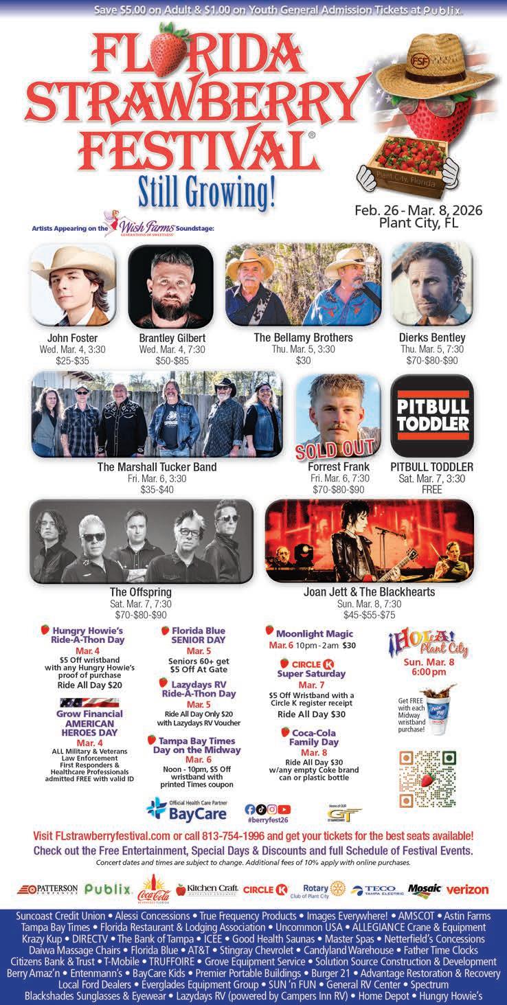 The 91st annual Florida Strawberry Festival returns to Plant City, featuring the theme “Still Growing.” This 11day event celebrates the strawberry harvest with daily concerts at the Wish Farms Soundstage, livestock shows and strawberry shortcake. Through Sunday; Strawberry Festival Grounds, 303 N. Lemon St., Plant City; $5-$15; 813-752-9194.