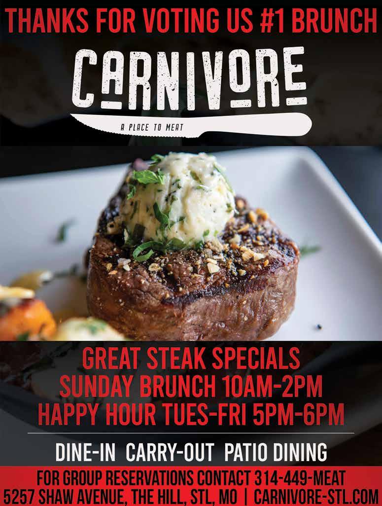 St. Charles mainstay Tony’s on Main Street (132 North Main Street, St. Charles; 636-940-1960) is equal parts steakhouse and Italian restaurant — the sort of place where you can get a juicy, perfectly cooked ribeye with a side of fettuccine and an order of cheese garlic bread. For years, this Main Street spot has been welcoming in crowds for its grilled meats — some of the best in the area — topped with a signature steak butter that’s so good, they sell it by the container. Located inside a dark, woodadorned historic storefront, Tony’s on Main is the undisputed place for steaks in St. Charles County. $$-$$$. Open Tuesday to Thursday 4 to 9:30 p.m., Friday and Saturday 3 to 10:30 p.m., and Sunday 4 to 8:30 p.m.