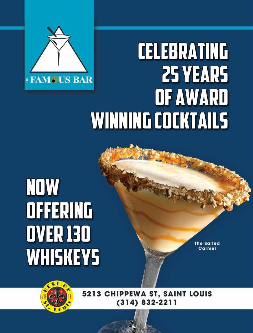 For 44 years, John D. McGurk’s (1200 Russell Boulevard, 314-776-8309) has been giving local bargoers an authentic taste of Ireland in the midst of St. Louis’ French quarter. Dimly lit and filled with exposed brick and dark wood, McGurk’s sprawling interior offers the preeminent place to experience a pint outside of the Emerald Isle — unless it’s a lovely autumn day, in which case you should enjoy that pint next to the fountain in the stunning courtyard. It’s no wonder Esquire named McGurk’s one of the best bars in America. A full menu of stickto-your-ribs food offerings pairs perfectly with the environment. $-$$. Gigantic patio. Opens at 4 p.m. Tuesday through Thursday and 11:30 Friday through Sunday.
