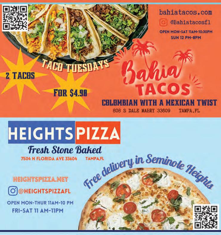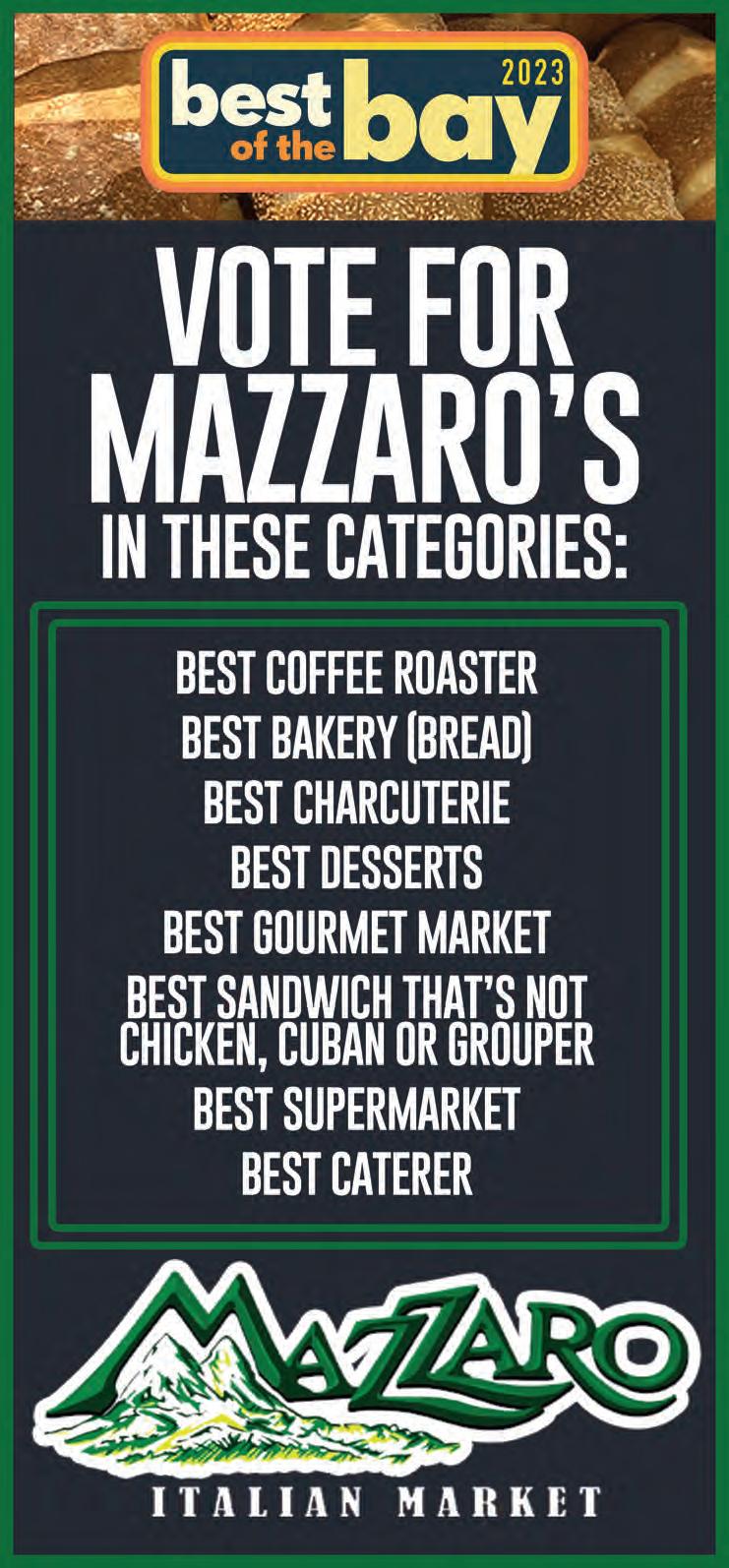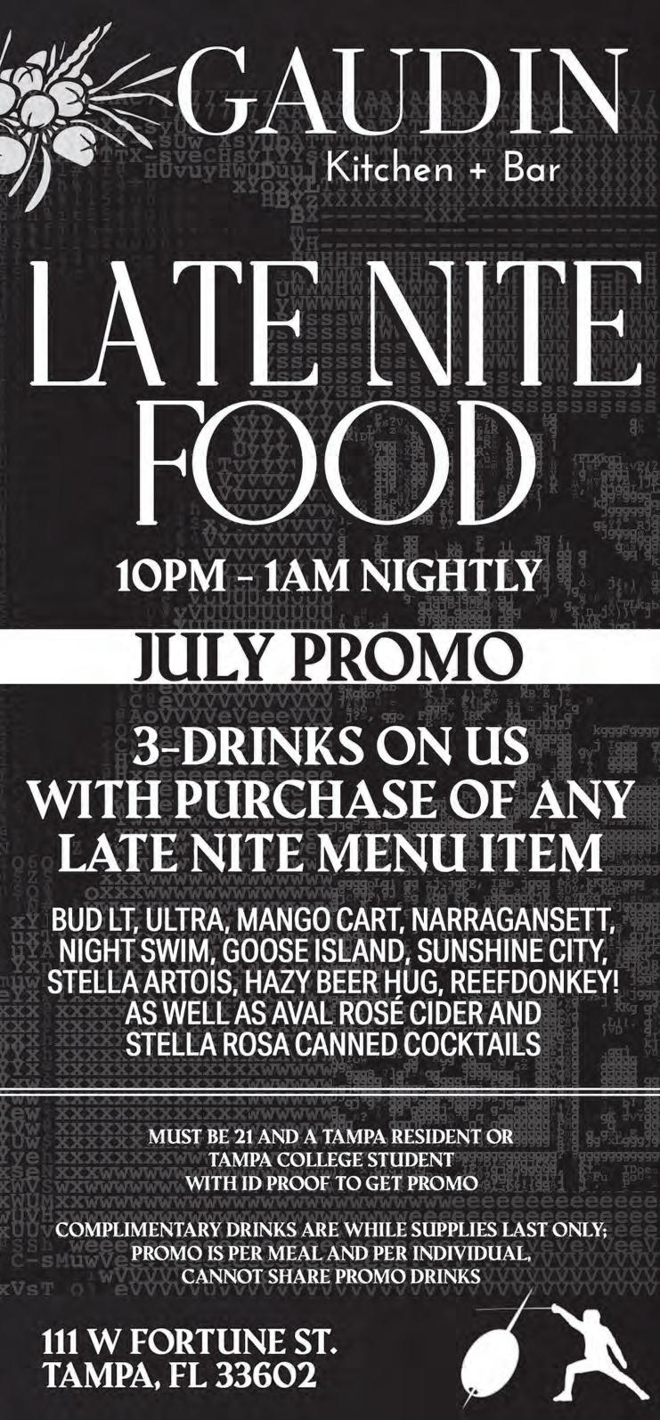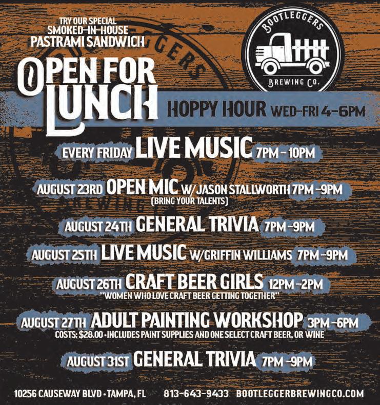6 | AUGUST 24-30, 2023 | cltampa.com AUGUST PROMO Lunch! *Dine-in only. Additions & substitutions at full price. Wine, Cocktail and Pizza Specials* Sun–Thu 10–11 pm | Fri & Sat 11 pm–1 am Monday–Friday 11:30 am–6 pm All-Day Happy Hour! Late Night! 1413 S. Howard Ave, Ste 100, Tampa, Florida 33606 bellasitaliancafe.com | 813-254-3355 lunch! all-day happy hour! late night! Monday–Friday 11:30 am–3 pm