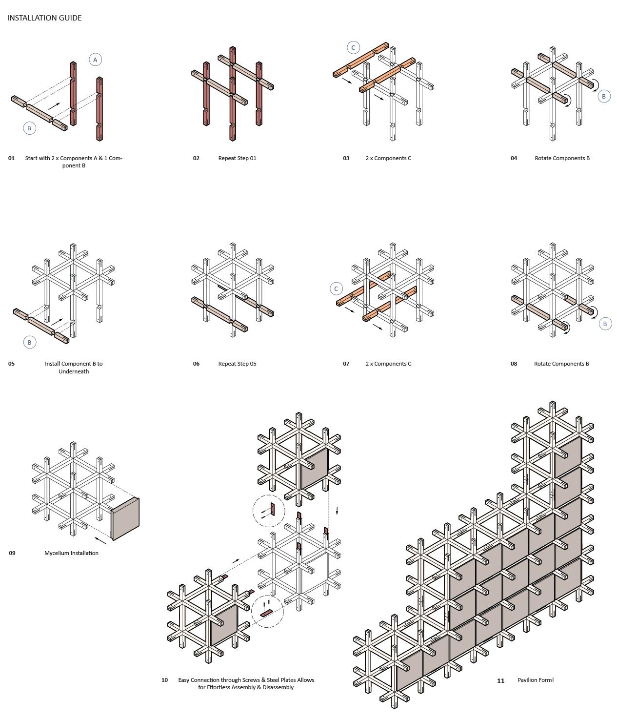 Group Work: Introducing a revolutionary pavilion, constructed with mycelium and Chidori joint technology, that seamlessly integrates sustainable architecture, offers versatility for various uses, prioritises eco-friendly design with easy assembly, and sets a forward-thinking standard for advanced construction techniques.