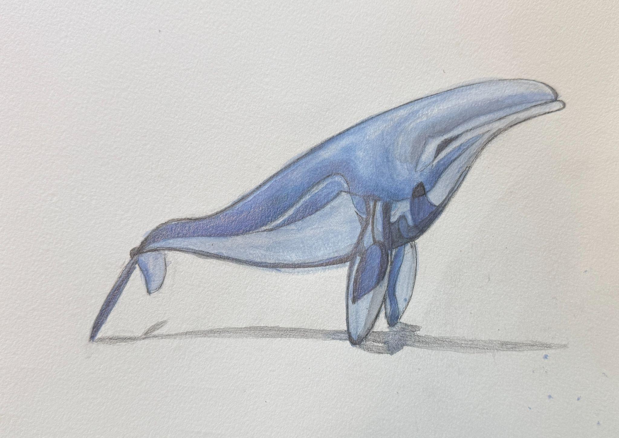 Ilearnedhowlightcanreflectthroughan object,especiallyglass.Thisactivity requiredmetobeveryattentivetoshadows ofvariousshapesandsizeswithintheglass whale,alongsidetheverylighthighlights wherethelightshonethrough. Additionally,asthisactivitywasalsodone withwatercolors,whichcannotbeerased, Ilearnedtopaintslowlyandcarefully.Imadesuretostartwithlightlayersandaddindeeper valuesdiligently.Overall,thisactivityhelpedteachmehowtopaycloseattentiontolightvs shadowsandhowtobepatientandcarefulwhiledesigning/makingart.