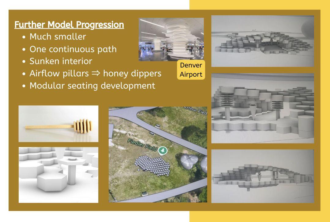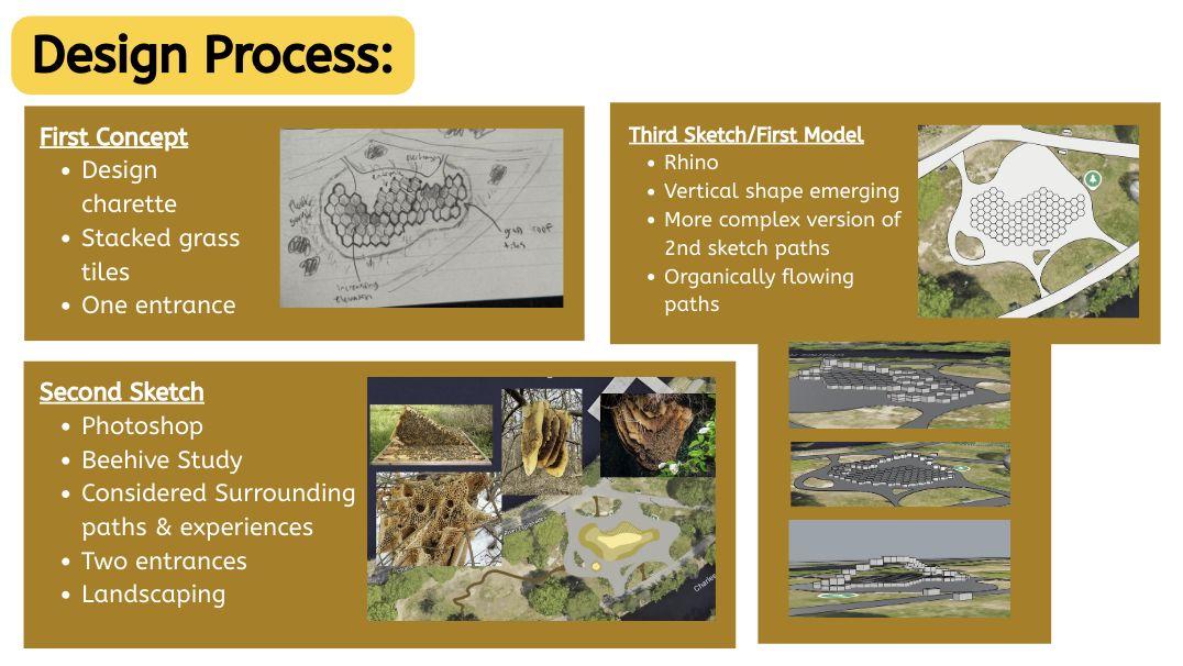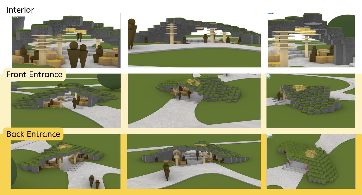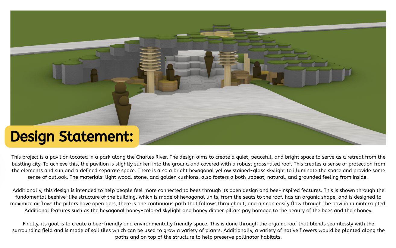Thisfinalprojecthelpedmelearntheimportanceoflettingyourselfexperimentindesign.Firstofall,asI wasnewtoRhinoatthebeginning,everythingItriedwasnewandunfamiliar,butthroughexploration,trial anderror,andnotbeingafraidtofair,Iwasabletoeventuallymaterializemyvision.Additionally,Ijust reallyletmyselfexploremanynewpossibilitiesinmydesignitself.Iexperimentedwithmanythingssuchas elevationanduniqueroofshapesthatIneverhadtriedbefore.WhenIfeltlikesomethingmightbebettera differentway,Iletmyselfchangemydesign;evenifitwasdrasticallydifferent,Ididn'tholdmyselfbackand waswillingtoexploredifferentperspectives.Studyingbeesinspiredmetocreateastructurethatsomewhat mimickedtheexperienceofabee,soIcreatedmypaviliontoresembleabeehivethroughitshexagonaltiles aswellastheorganicshapedesignedtomaximizeairflow.Attemptingtointegratebeesintomydesignsalso reallyhelpedmydesignprocessasitgavemeamorecleargoaltostrivefor,promptingmetopursueavariety ofuniqueideassuchasthehoneycombpillars.Overall,Ilearnedthisprojecthashelpedmeunderstandthe valueofchallenges.Challenges,whethertheyarelearninganewprogramorfollowingspecific guidelines/restraints,provideexcellentopportunitiesforgrowth.Theypushyoutoaction,canserveas excellentinspiration,andprovidenewconceptstoexplore.